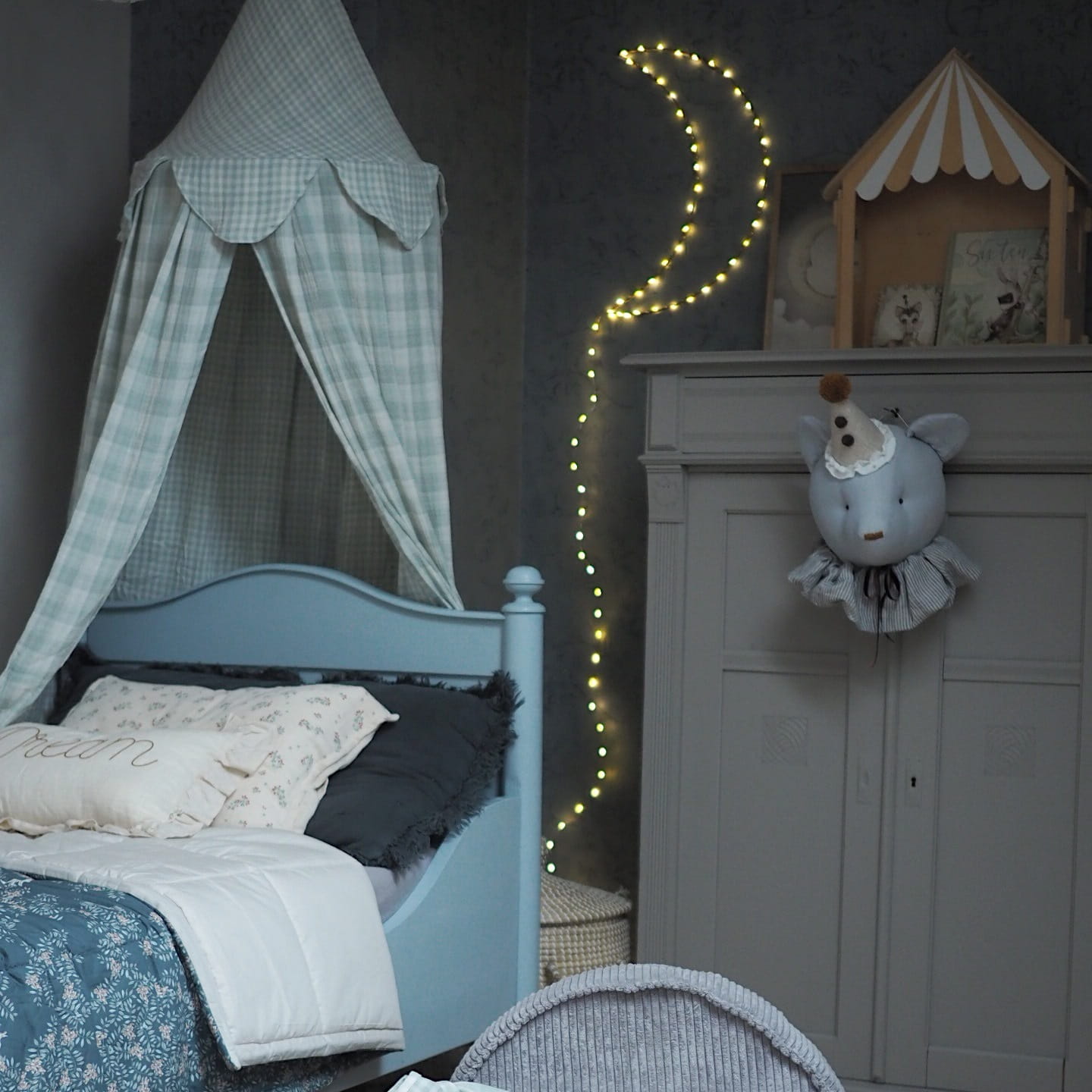 Baldachim to wyjątkowa dekoracja pokoju dziecięcego, a jednocześnie klimatyczne miejsce do relaksu dla dziecka. Zwieszajmy go do haczyka sufitowego (nie ma go w zestawie), Wycisza, ogranicza przestrzeń nad dziecięcym łóżeczkiem, stworzy bezpieczne miejsce do odpoczynku. Baldachim wykonany jest z muślinu bawełnianego double gaze, kolor miętowy z połączony z jasnym szarym odcieniem. Z jednej strony duża krata, z drugiej mała kratka.
