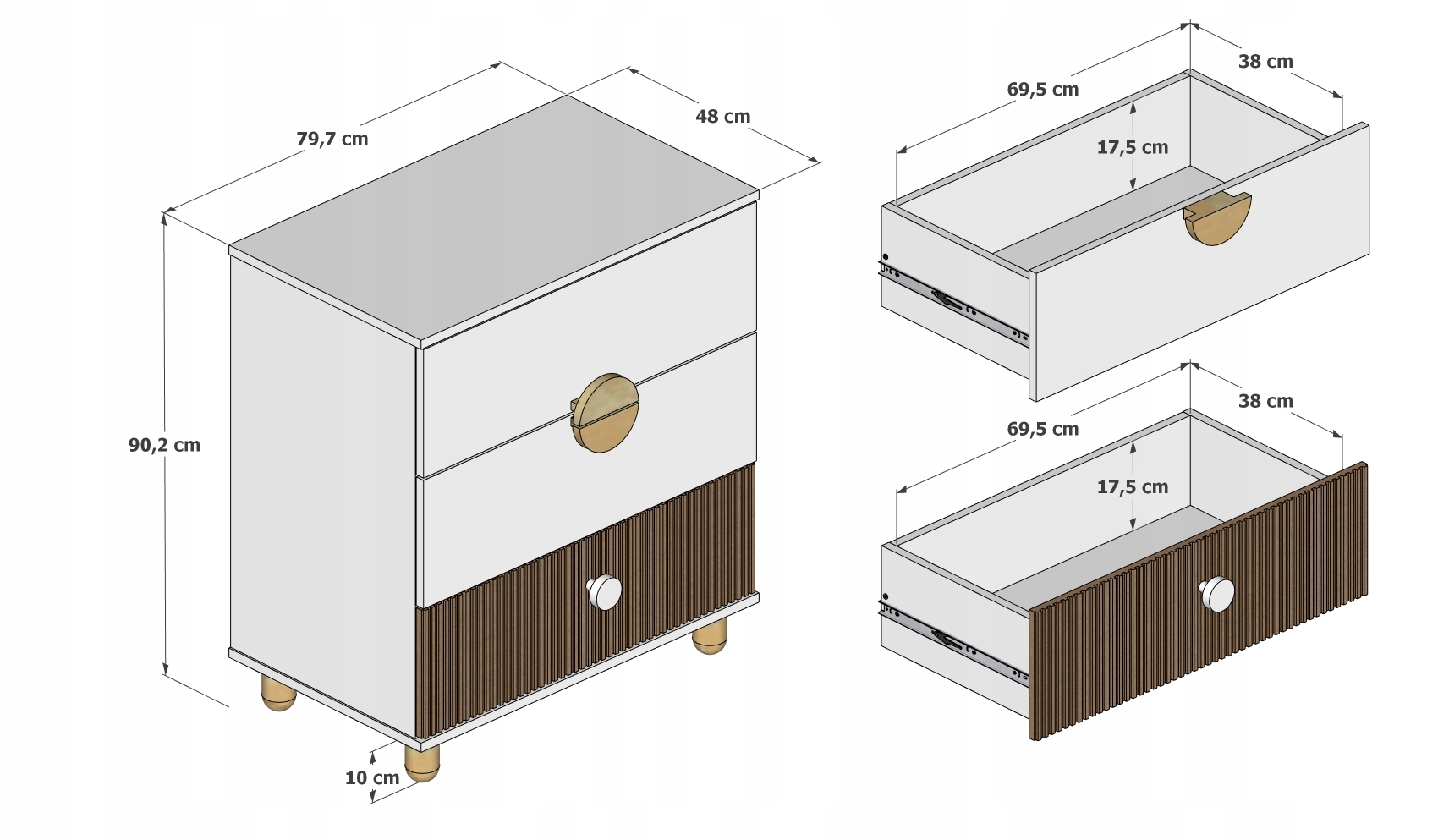 Trzy pojemne szuflady z systemem cichego domyku zapewniają komfort użytkowania i dużo miejsca do przechowywania.