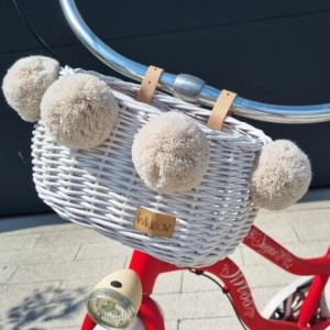 Biały wiklinowy koszyk na rower dla dzieci Dumpy z pomponami