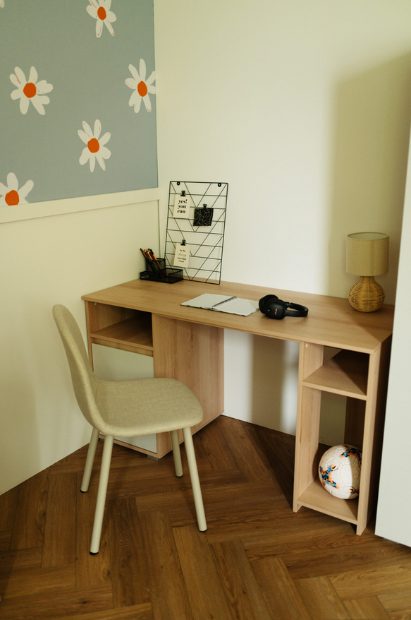 Biuro z kolekcji DALIA to połączenie popielatego z ciepłym bukiem. Szuflady i półeczki pomogą w organizacji przestrzeni, a duży blat pozwoli na swobodną naukę w skupieniu.