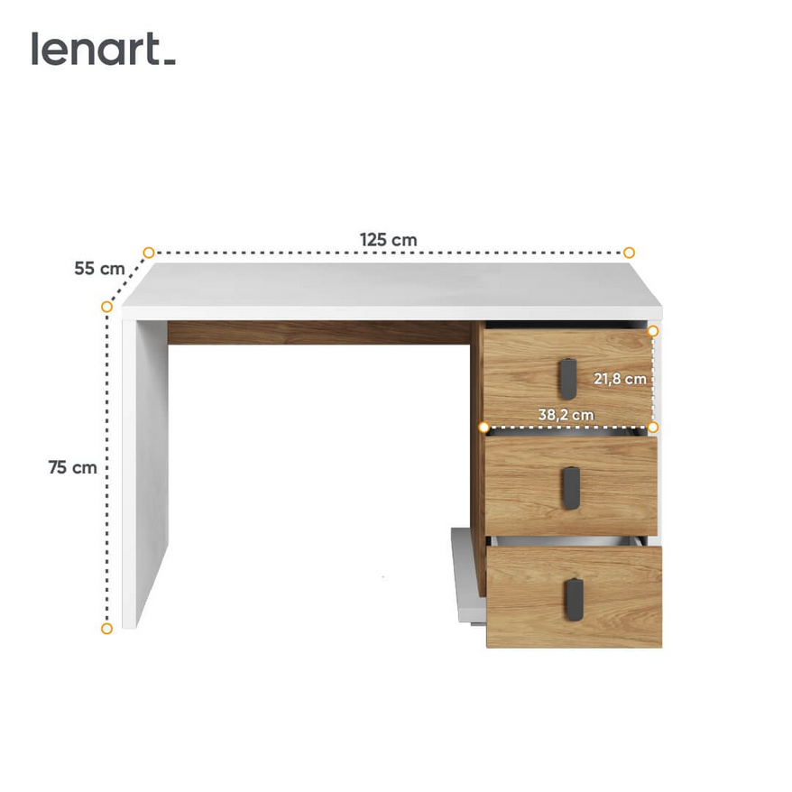 Praktyczne biurko SIMI MS‑06 o szerokości 125 cm, z trzema pojemnymi szufladami — idealne do nauki i pracy. Elegancka biel połączona z dekoru hikora naturalna zapewnia styl i porządek.