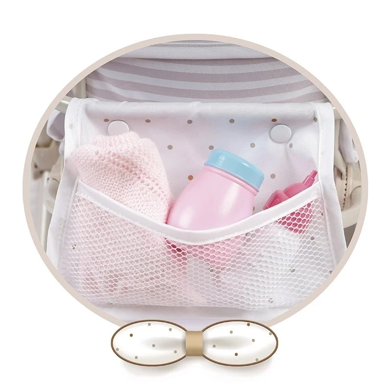 Wózek Verona został wyposażony w stylową torbę na akcesoria, która pozwala zabrać ze sobą wszystkie niezbędne dodatki dla lalek. Ciche kółka z piankowymi osłonami zapewniają płynne prowadzenie i nie rysują podłogi, co czyni zabawkę idealną również do użytku w domu.