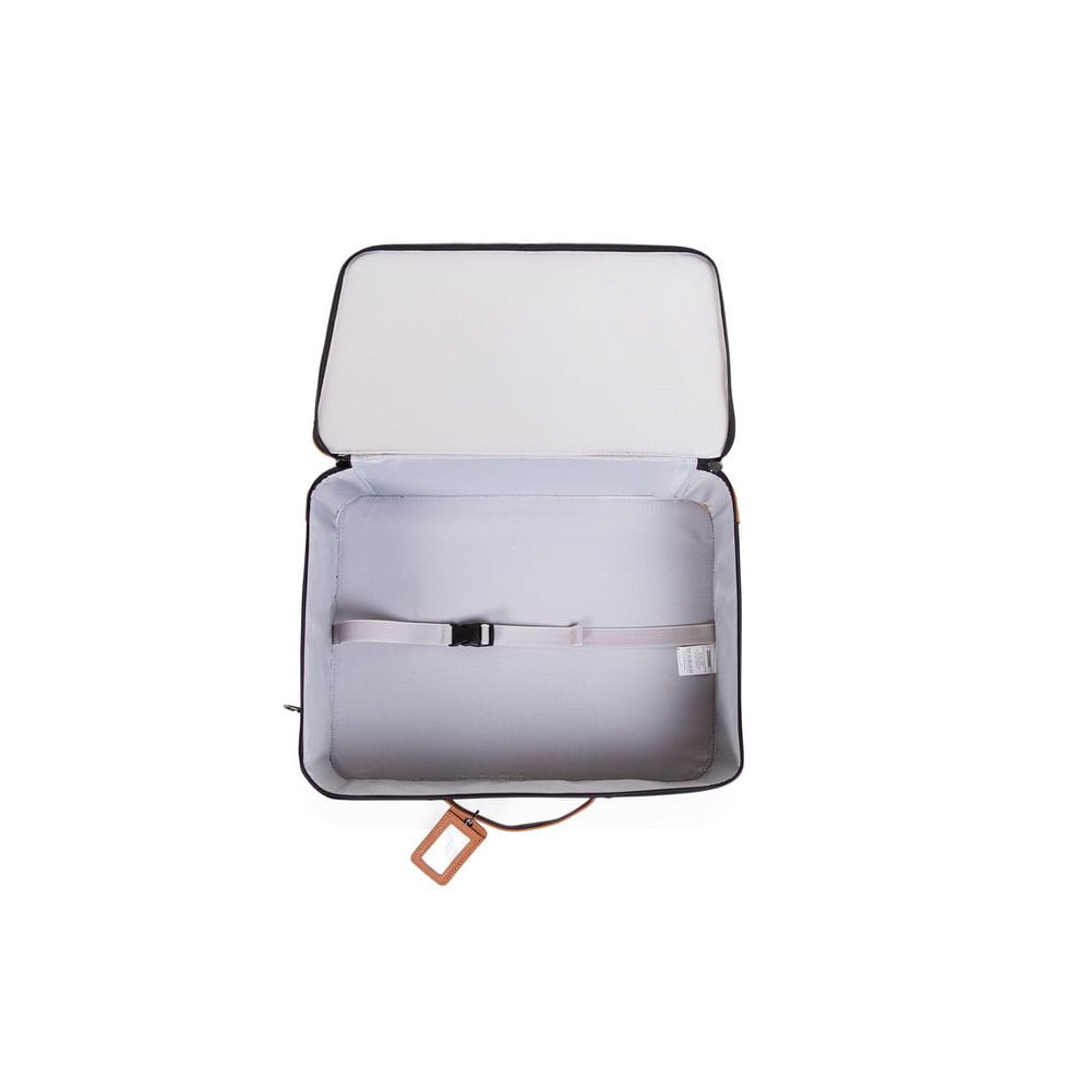 Walizka świetnie się prezentuje, jest kompaktowa, ale też bardzo pojemna. W środku jest dużo miejsca na ubrania i zabawki, które zabezpieczyć i posortować można gumowym paskiem na klamerkę. W zestawie jest także pasek, dzięki któremu możemy nosić walizkę jak torbę oraz przywieszka na dane małego właściciela. Walizka jest zabezpieczona od spodu oraz na rogach wstawkami z eko skóry.