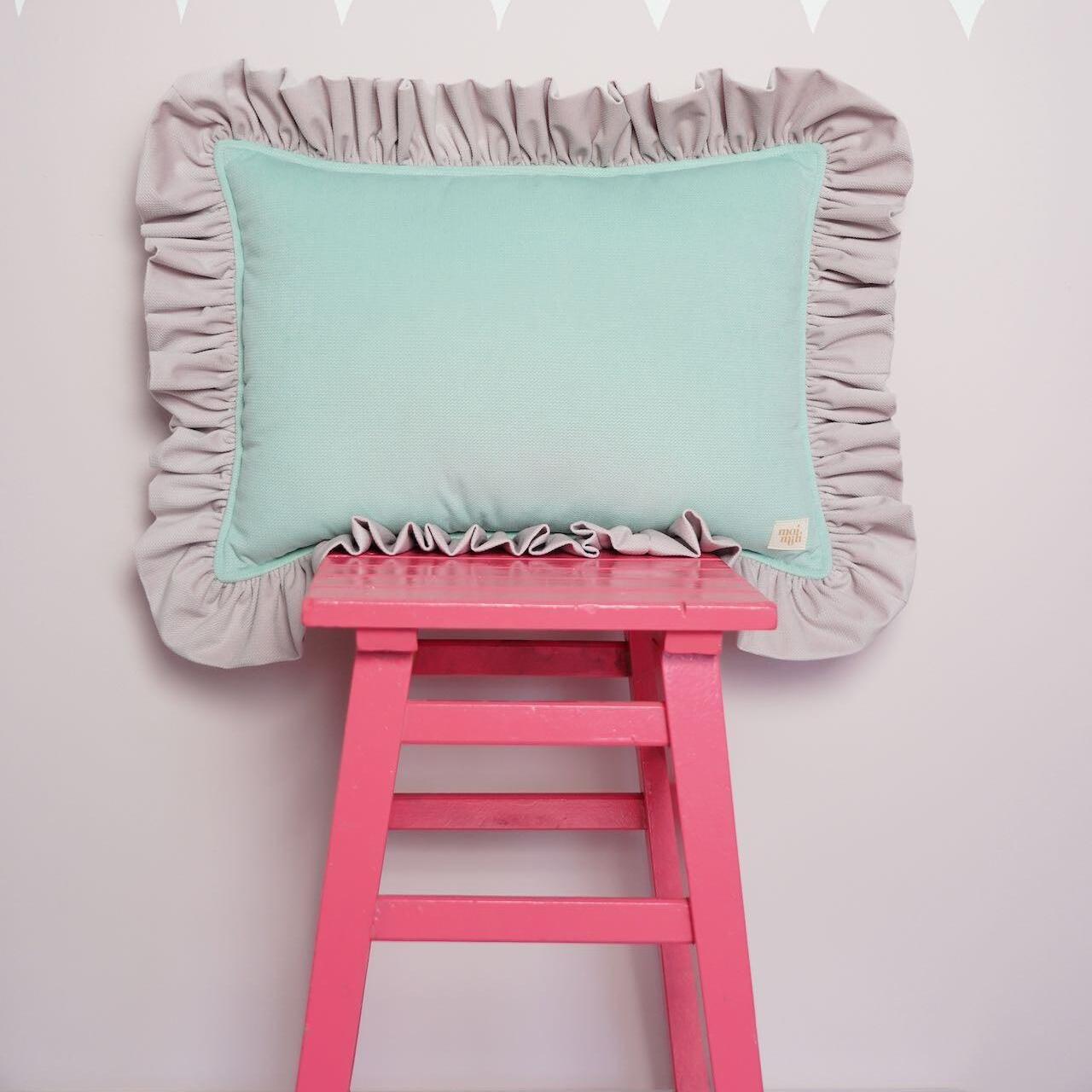 Dekoracyjna, welwetowa poduszka z falbanką “Truskawkowa matcha”