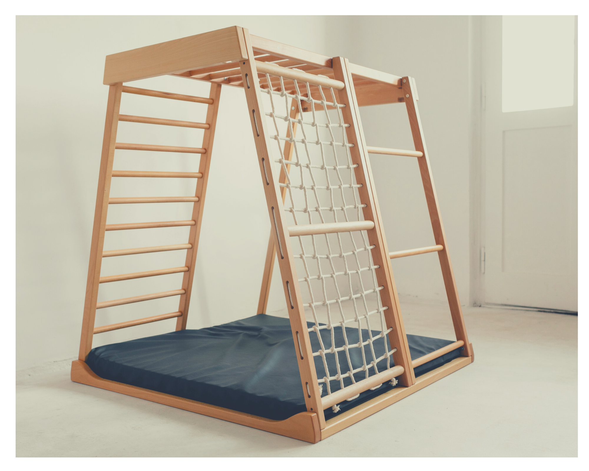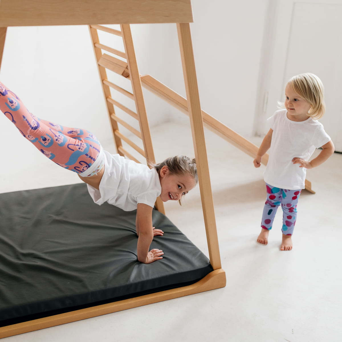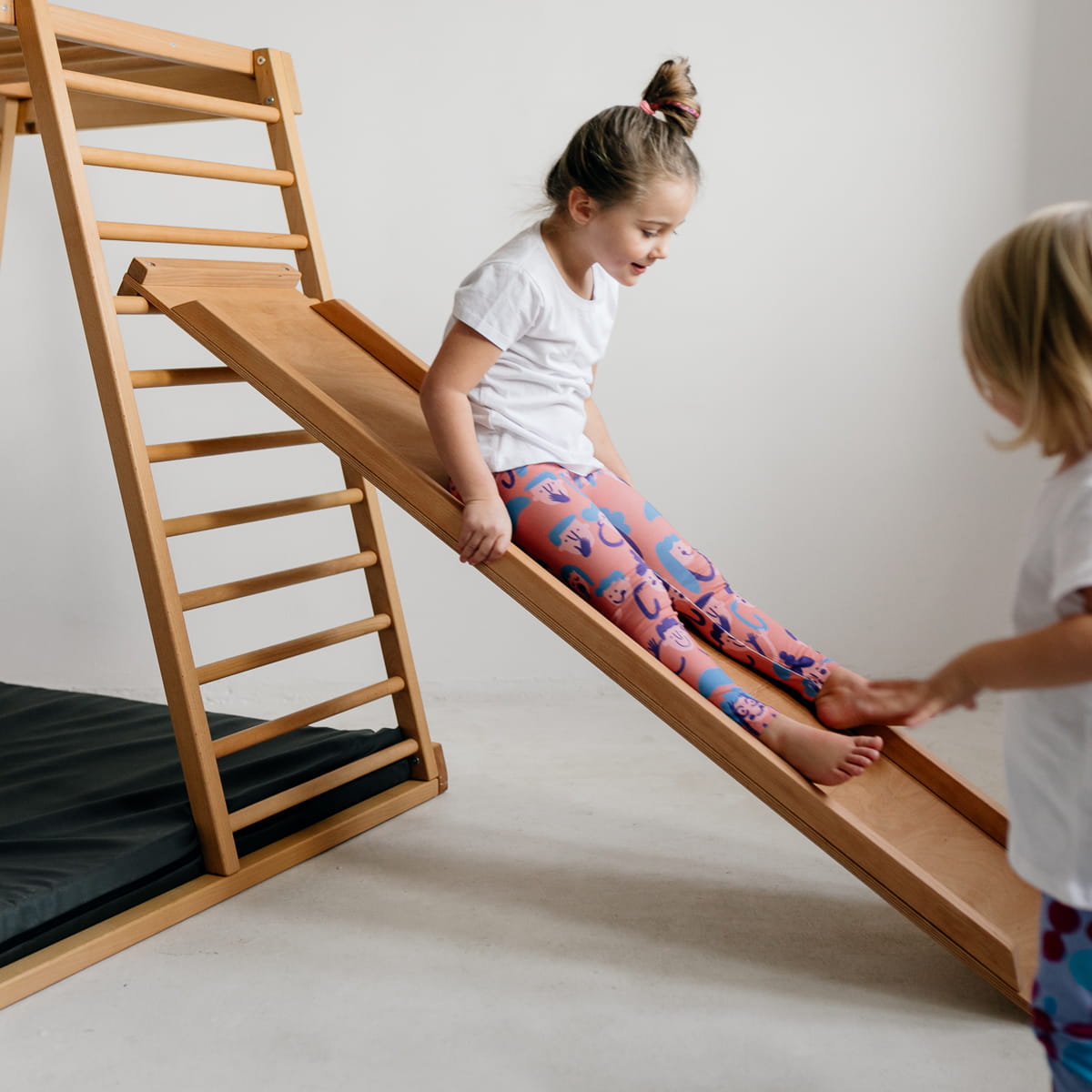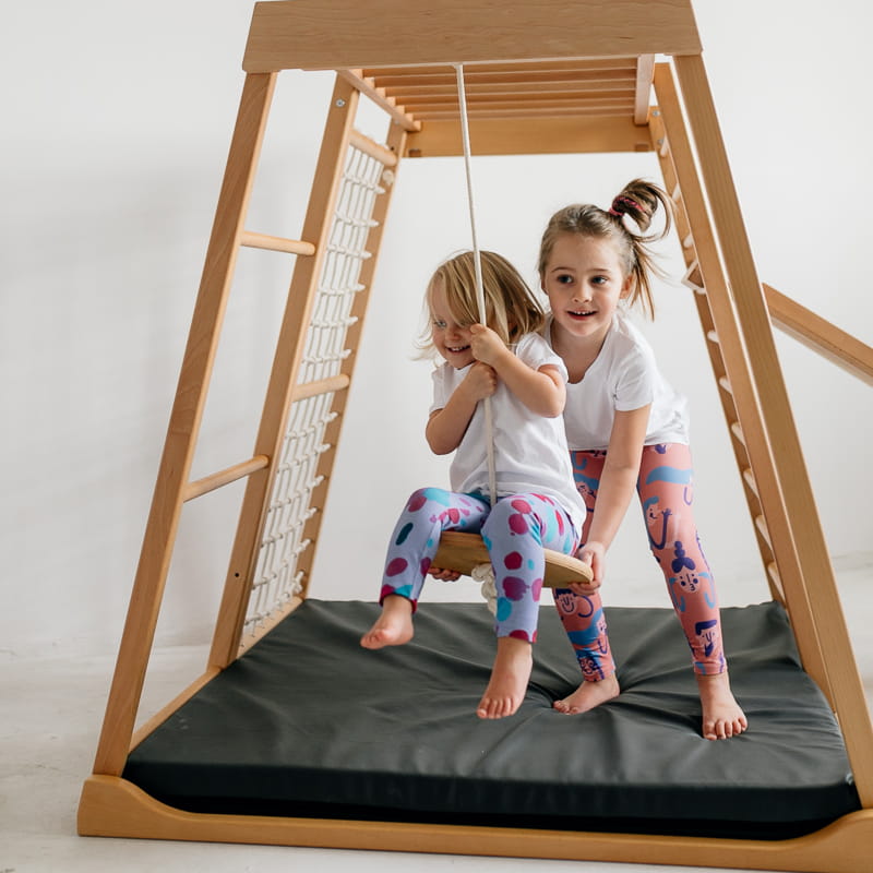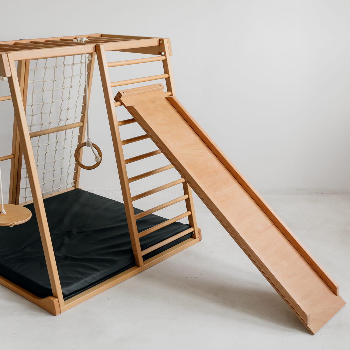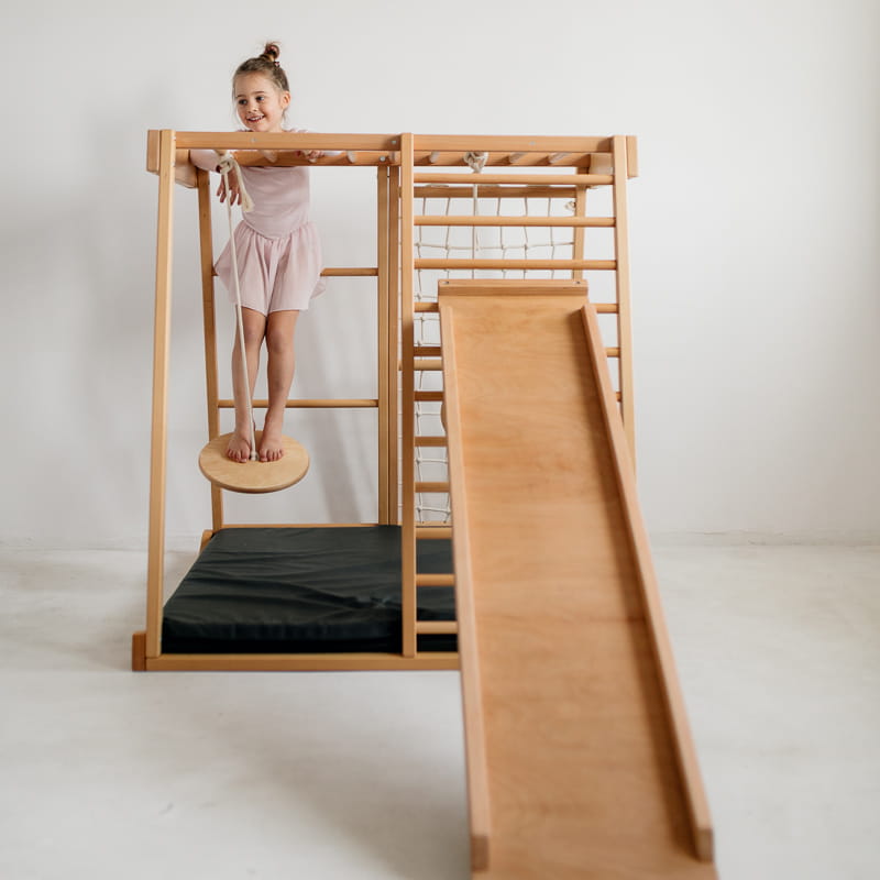 Wersja maxi: domowy plac zabaw dla dzieci z materacem, zjeżdżalnią, ścianką wspinaczkową, kołami gimnastycznymi i okrągłą huśtawką