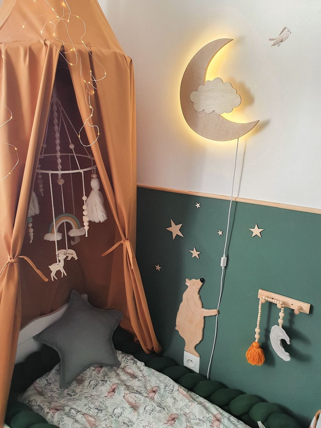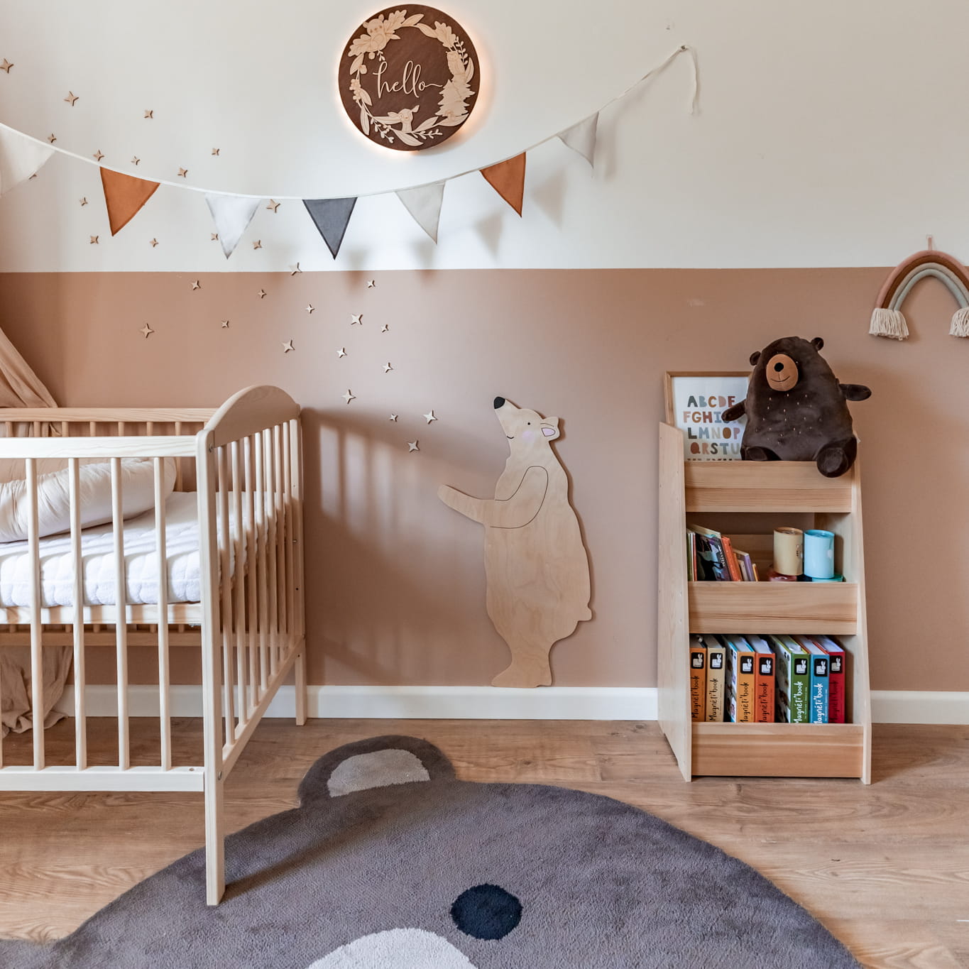 Delikatny i stylowy miś w naturalnym kolorze dodaje dziecięcemu pokojowi ciepła i wyrazu. Jego niewielkie rozmiary (40 × 20 cm) sprawiają, że jest idealnym, subtelnym dodatkiem nad łóżeczkiem lub na komodzie — bez nadmiernego obciążania przestrzeni.
