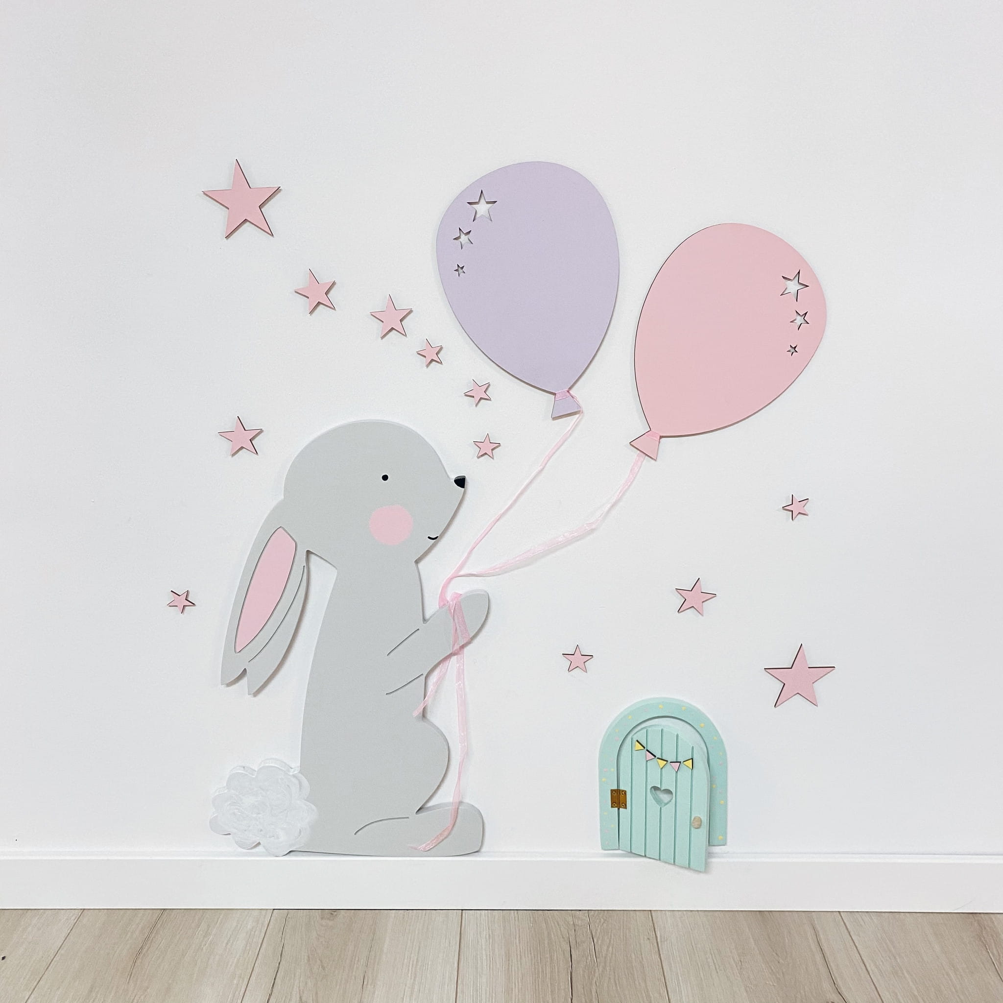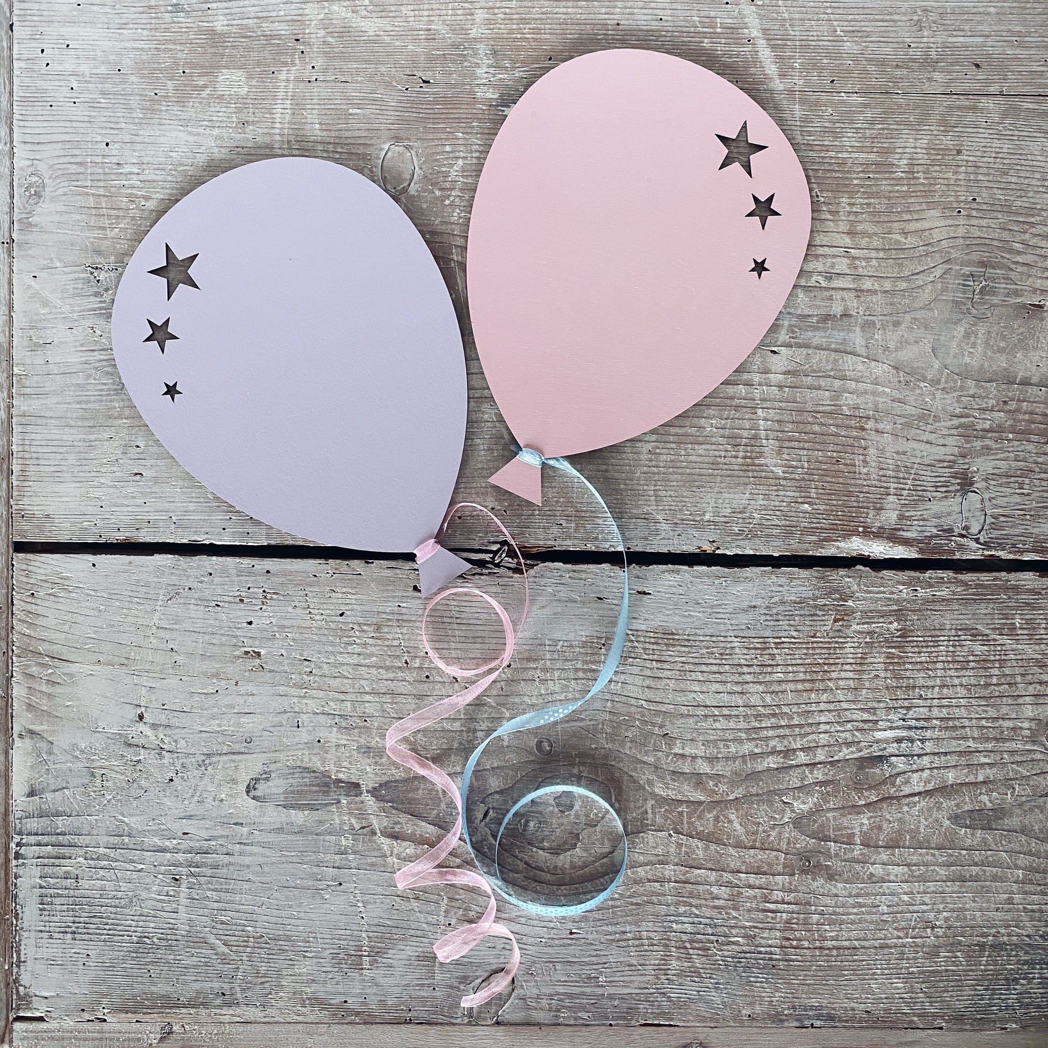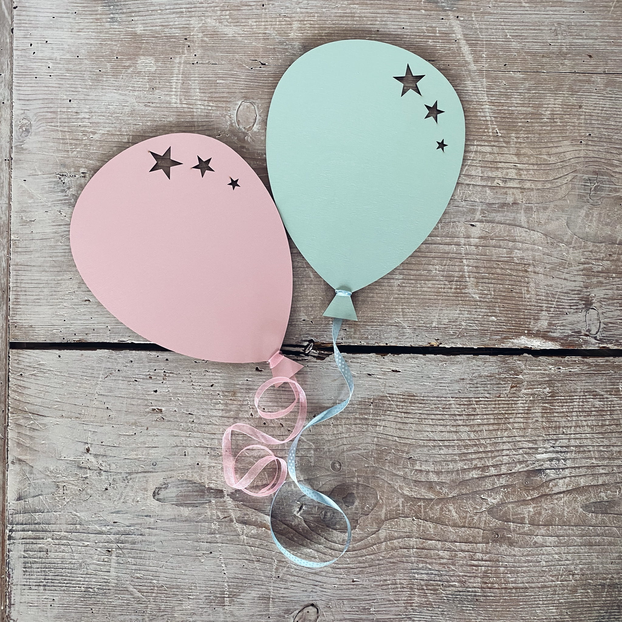 Delikatny zestaw dekoracyjny składający się z dwóch drewnianych baloników z wyciętymi gwiazdkami, wykonany z ekologicznej sklejki (3 mm). Zamów w wybranym kolorze, dodatkowo otrzymasz tasiemki oraz masę montażową, by z łatwością przykleić baloniki do ściany.
