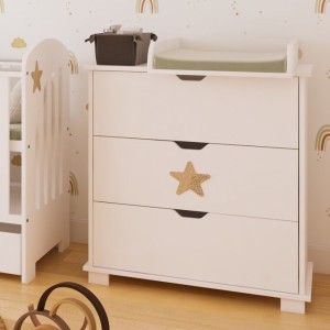 Drewniana komoda STAR z trzema szufladami i przewijakiem. Funkcjonalna, stylowa i bezpieczna – idealna do pokoju maluszka.