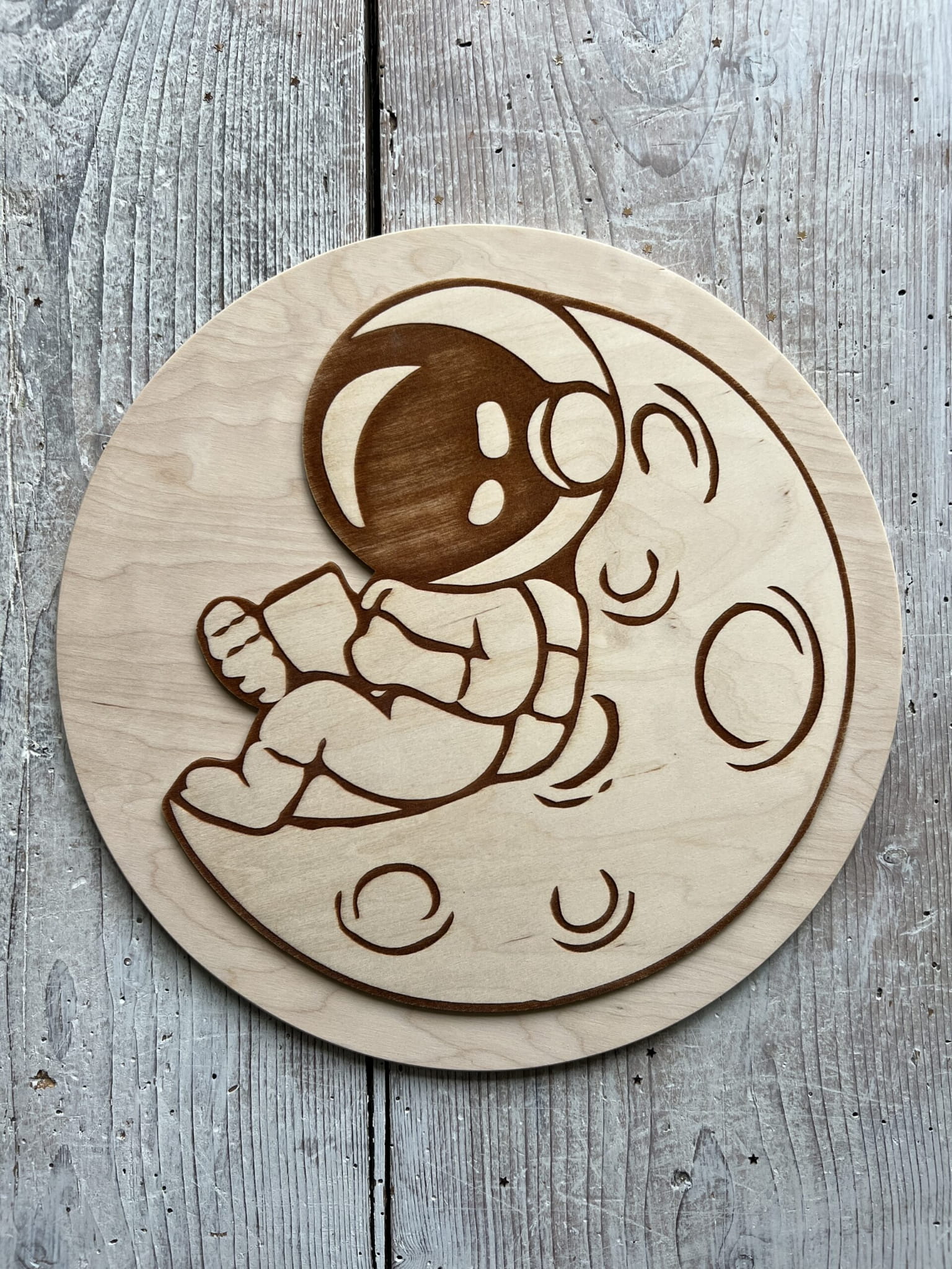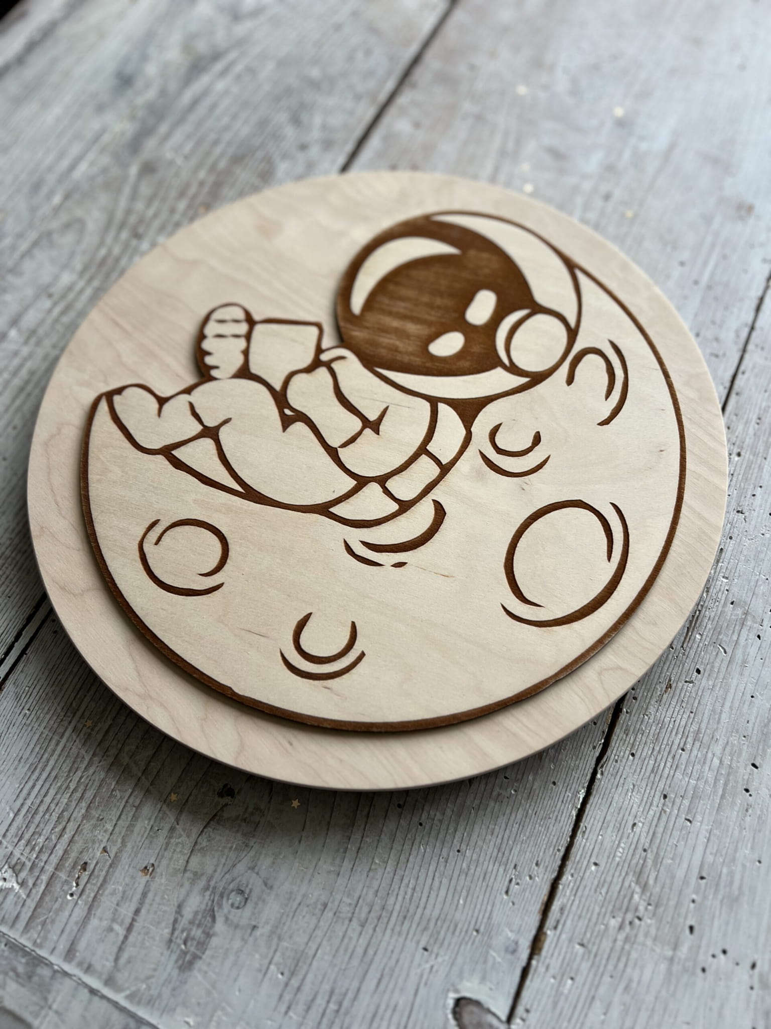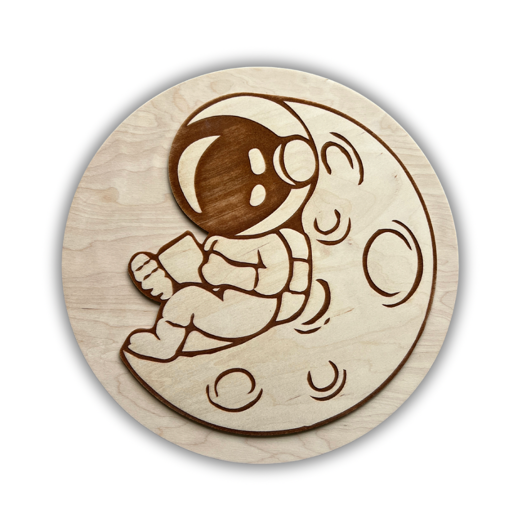Drewniana lampka nocna „Astronauta na Księżycu” – kreatywna dekoracja do pokoju dziecka