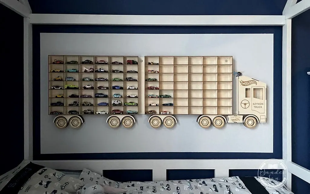 To praktyczny garaż na resoraki i piękna dekoracja pokoju chłopca, która uczy porządku i rozwija pasję do motoryzacji.