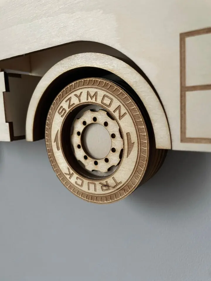 Półkę Montessori można spersonalizować – imię dziecka grawerujemy na kołach i kabinie ciężarówki, co sprawia, że staje się niepowtarzalnym prezentem dla małego fana motoryzacji.