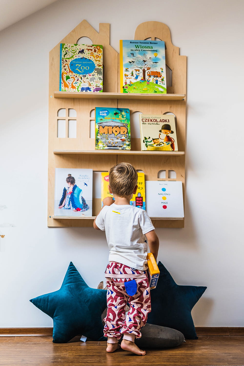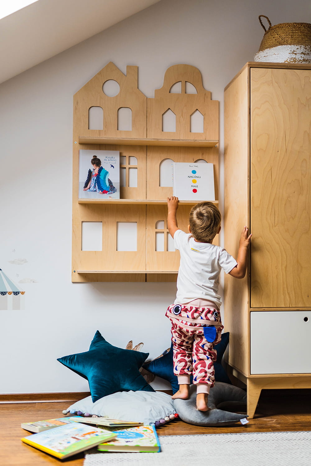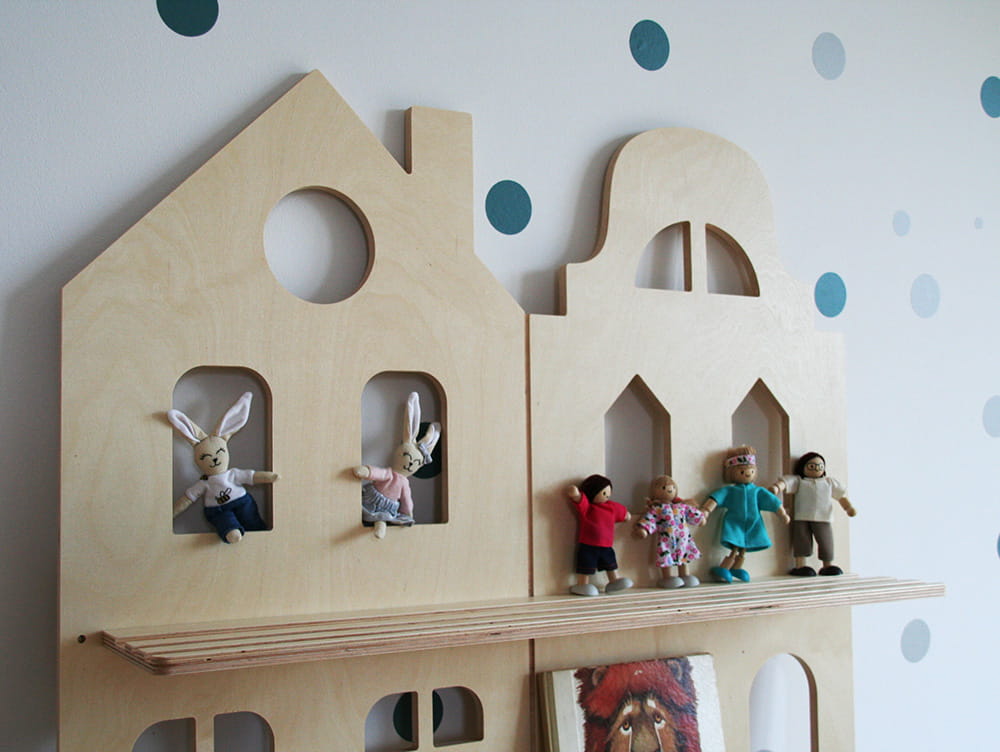 Półka na książki Otwarta, wisząca półka na książki i bibeloty malucha. Dzięki niej ulubione bajki można mieć na wyciągnięcie ręki. Mebel o trzech kondygnacjach nadaje się do eksponowania frontu książek. Jest utrzymany w stylistyce Parawanu Wielofunkcyjnego. Całość można montować do ściany przy pomocy dołączonych do zestawu kołków.