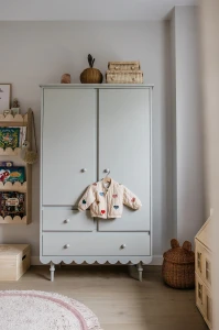 Dwudrzwiowa szafa z kolekcji mebli dziecięcych Babushka to połączenie elegancji, funkcjonalności i ponadczasowego stylu, które doskonale sprawdzi się w dziecięcym pokoju.