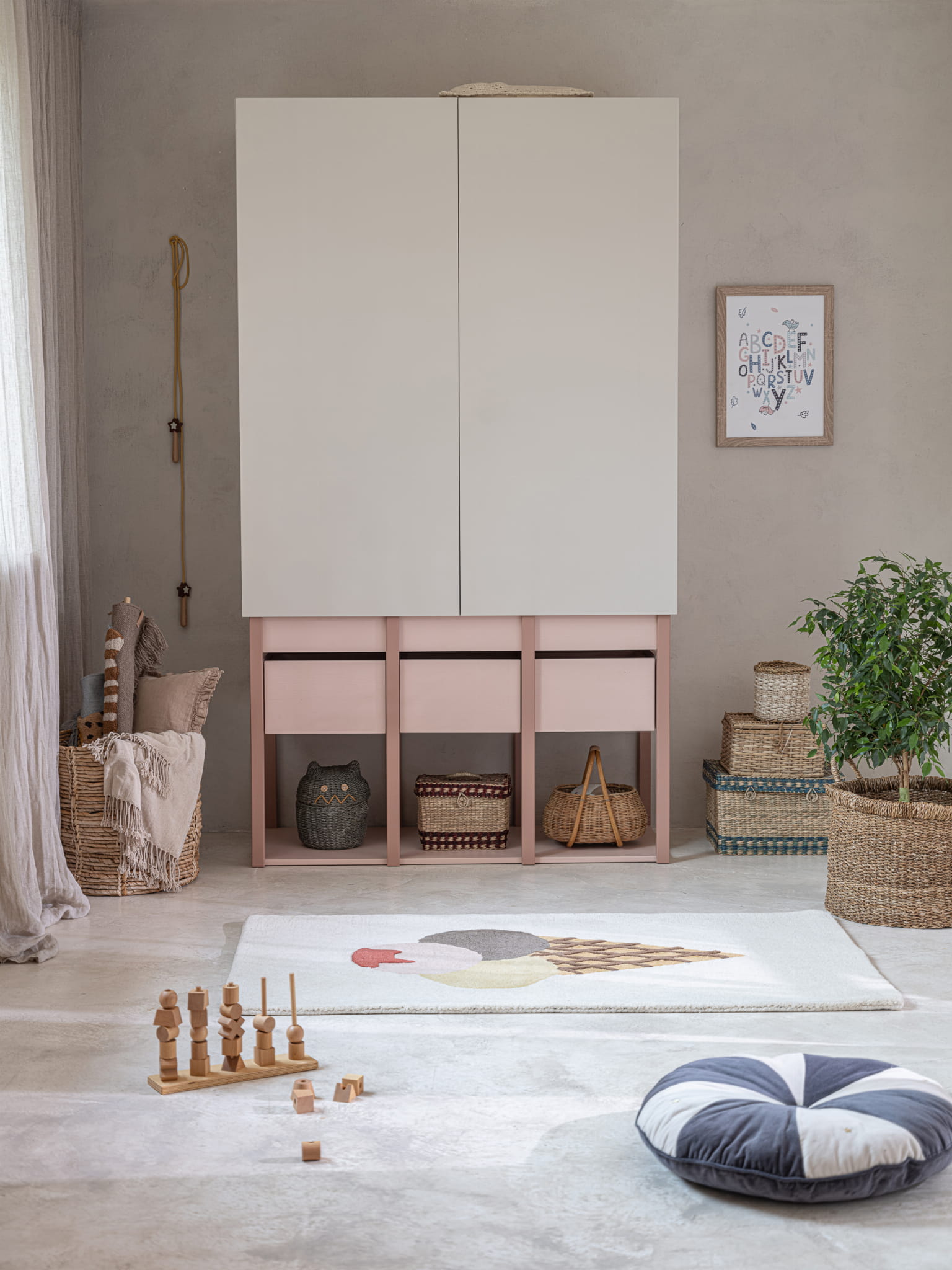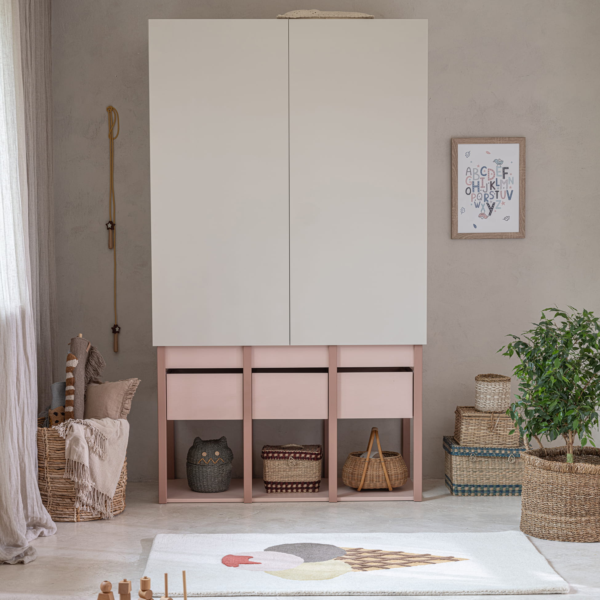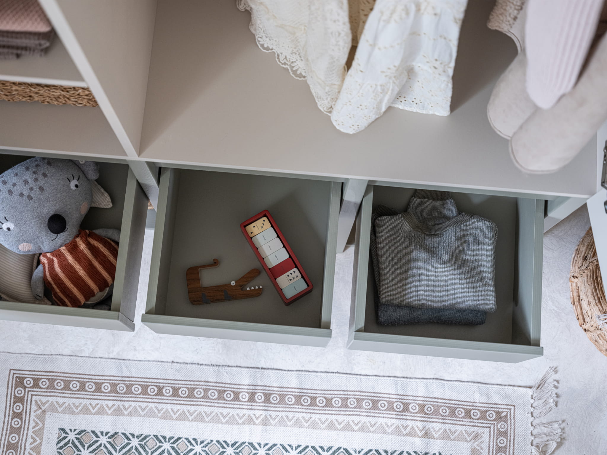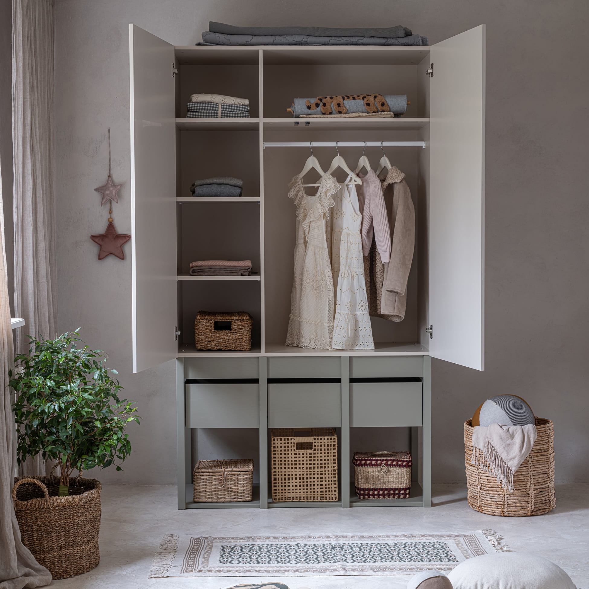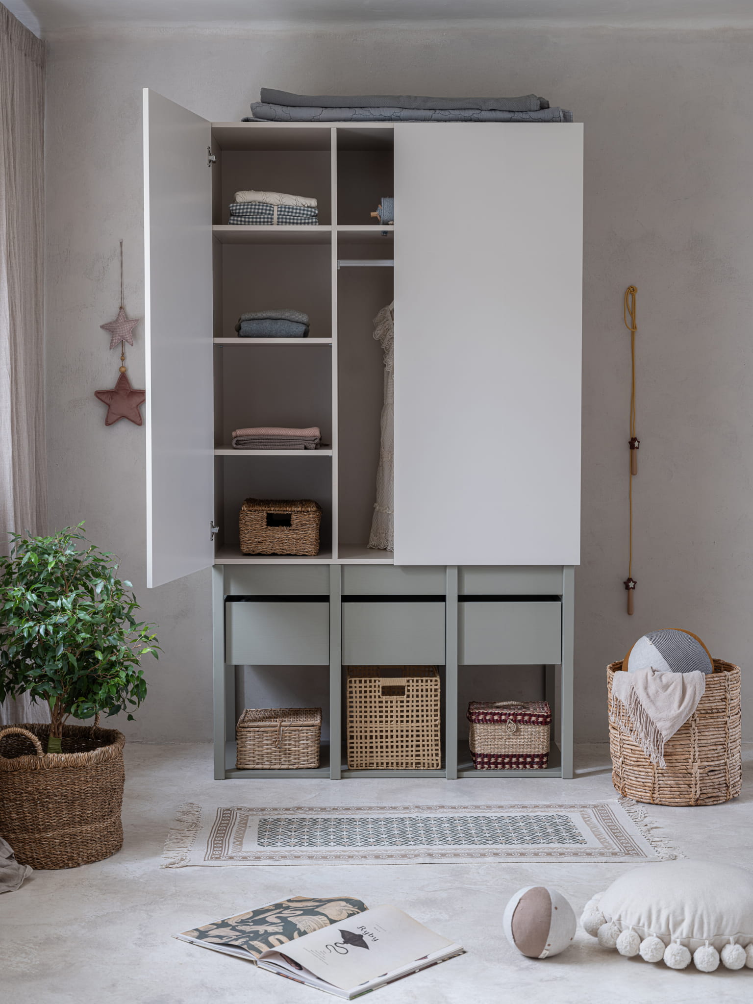 - Samodzielność dziecka – inspirowana metodą Montessori, szafa umożliwia dziecku swobodny dostęp do swoich rzeczy, wspierając rozwój organizacyjnych nawyków.
