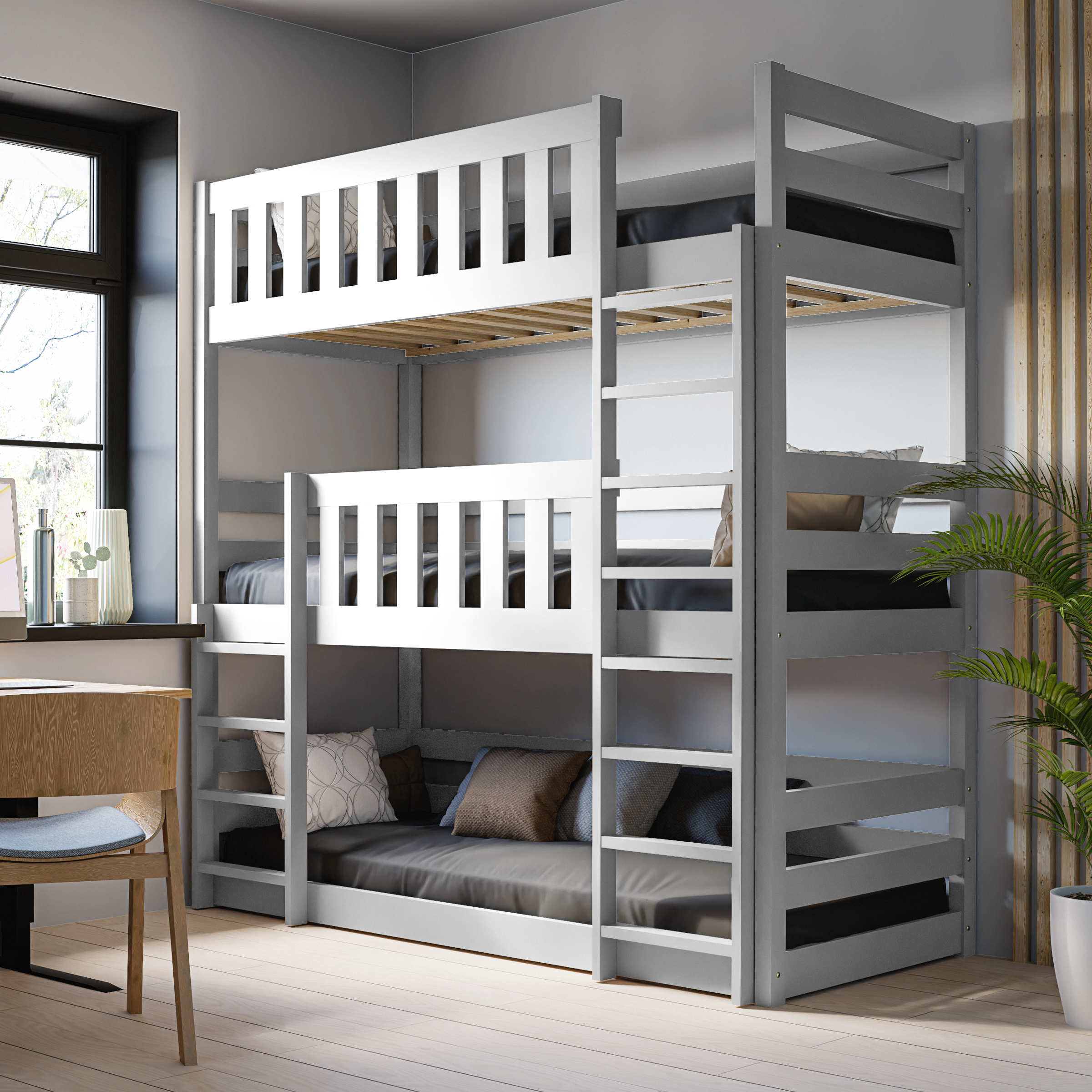 Łóżko 3-piętrowe Jacek to idealne rozwiązanie dla dużych rodzin, które potrzebują funkcjonalnego, bezpiecznego i przestronnego miejsca do spania. Dzięki wyjątkowej konstrukcji piętrowej, zapewnia komfortowy sen aż trzem osobom, oszczędzając przy tym miejsce w pokoju. Solidna budowa, nowoczesny design i wykończenie w duchu Montessori sprawiają, że łóżko doskonale wpisuje się zarówno w dziecięce, jak i młodzieżowe wnętrza.