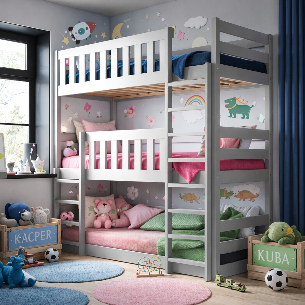 Drewniane Łóżko Piętrowe 3-osobowe Montessori Jacek – bezpieczne, funkcjonalne i przestronne łóżko dla dzieci i nastolatków. Polski produkt z solidnego drewna, idealny do większych rodzin i oszczędzania miejsca w pokoju. Sprawdź pełną ofertę łóżek piętrowych w Ola4Kids.