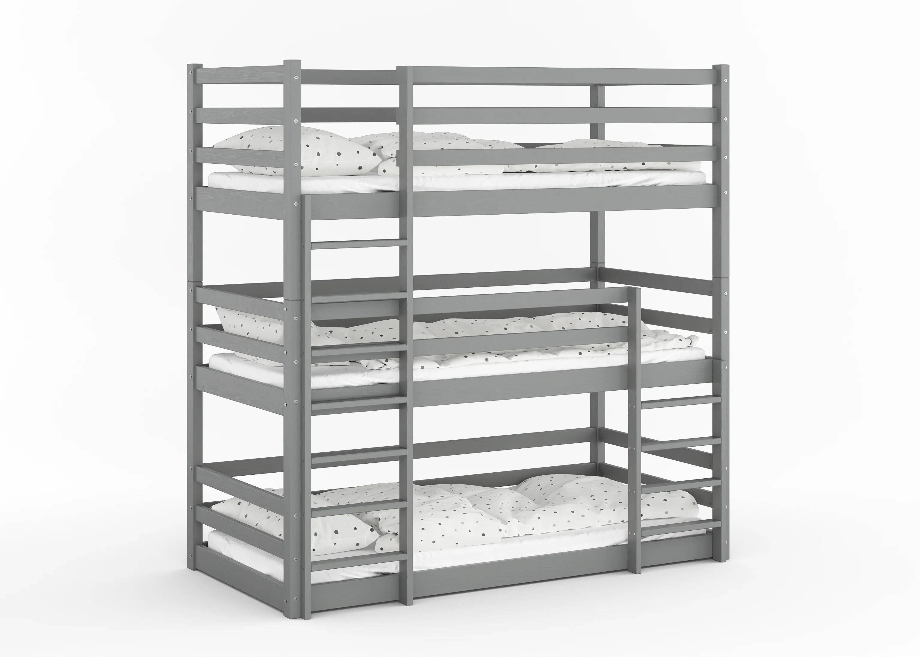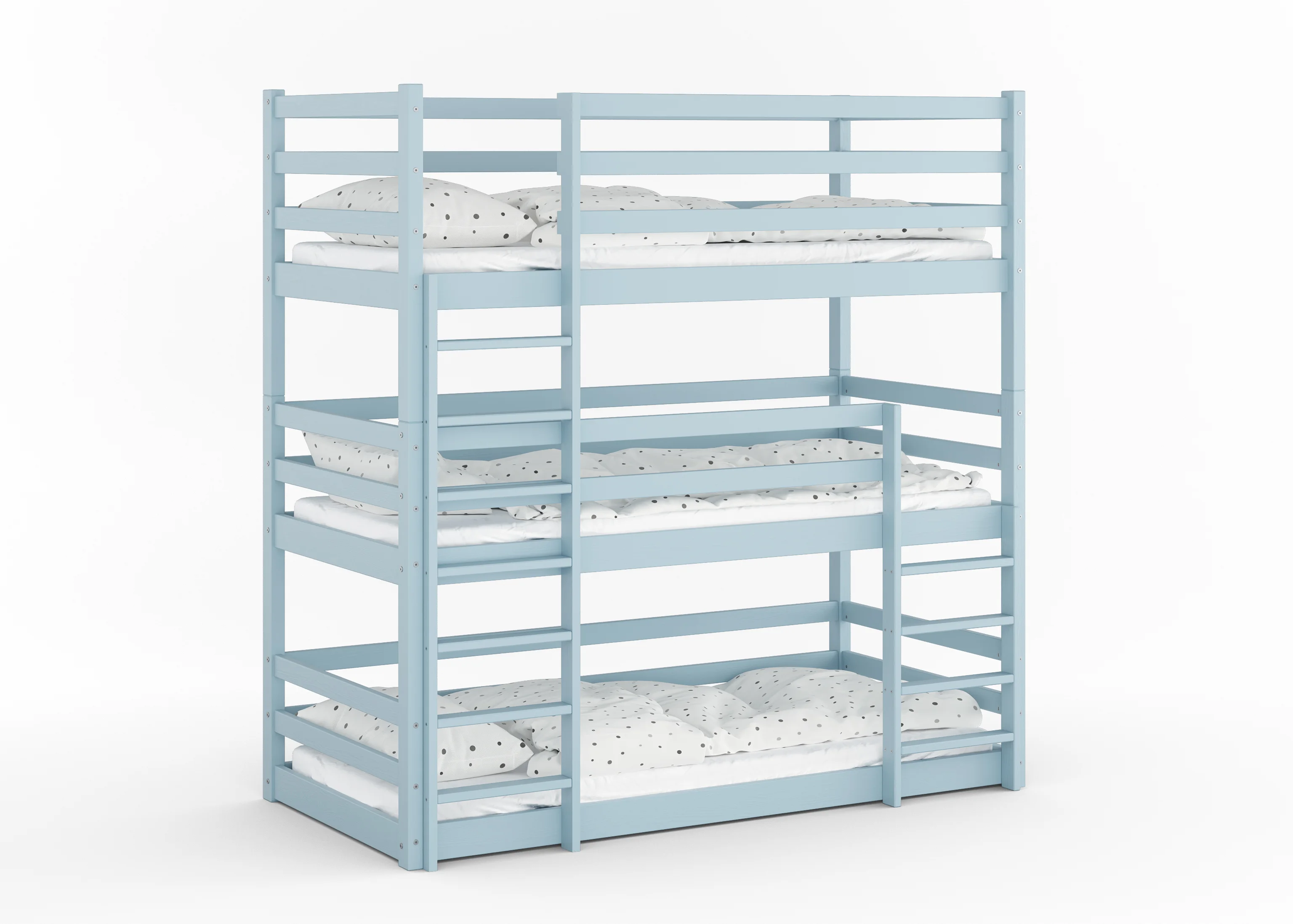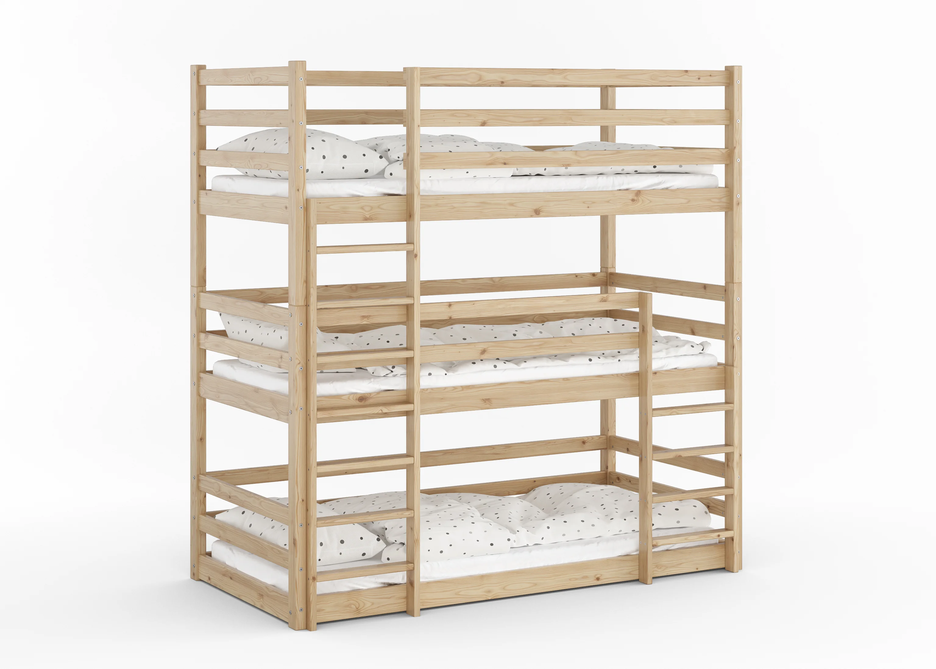 Drewniane łóżko piętrowe 3-osobowe Treko to solidne i bezpieczne rozwiązanie dla rodzeństwa, wykonane z litej polskiej sosny. Wytrzymałość do 150 kg na każdy poziom oraz podwyższone barierki gwarantują komfort i bezpieczeństwo na najwyższym poziomie.