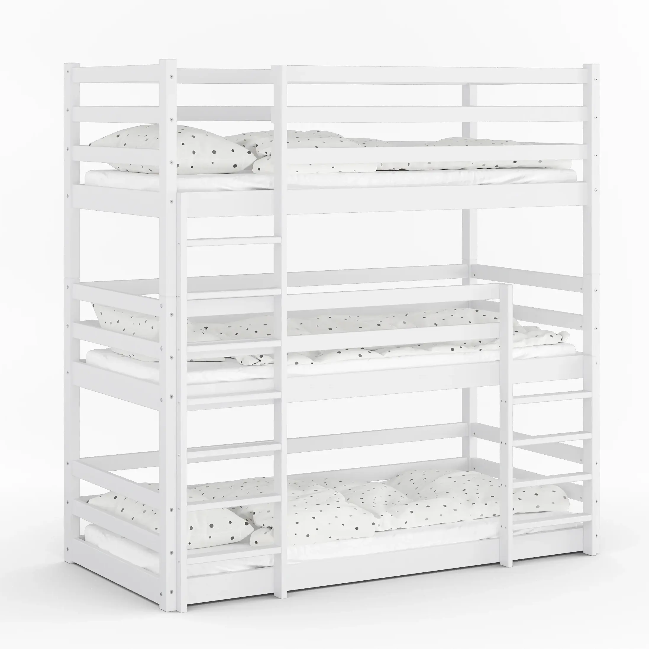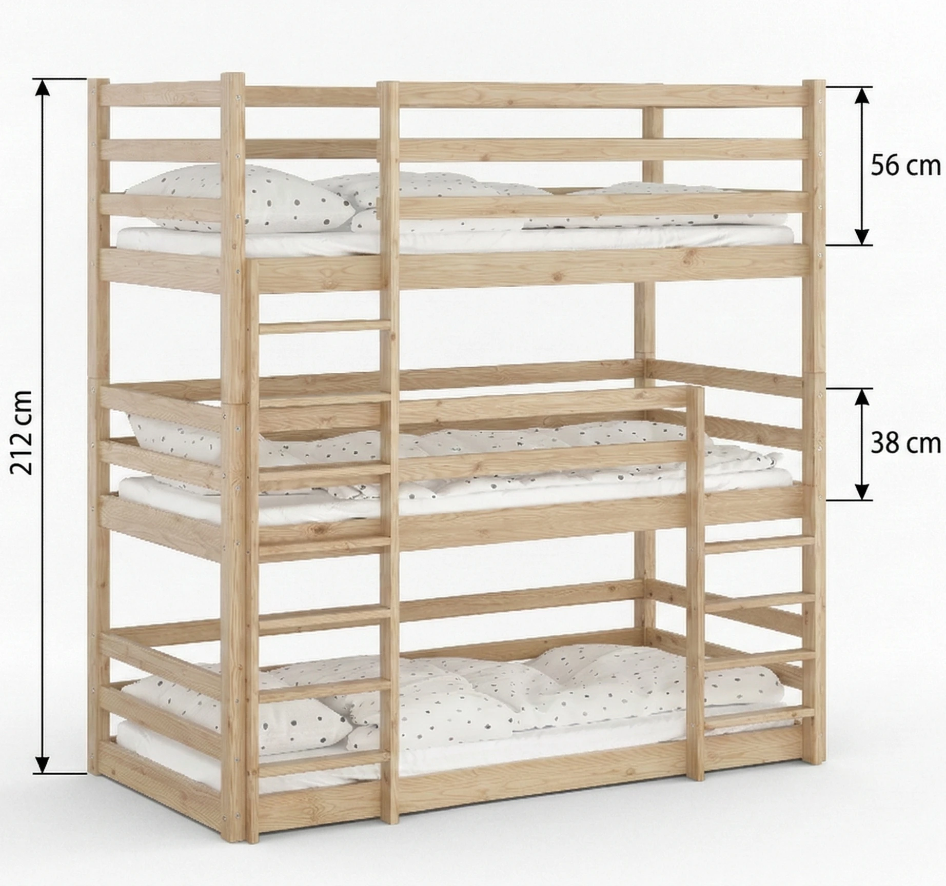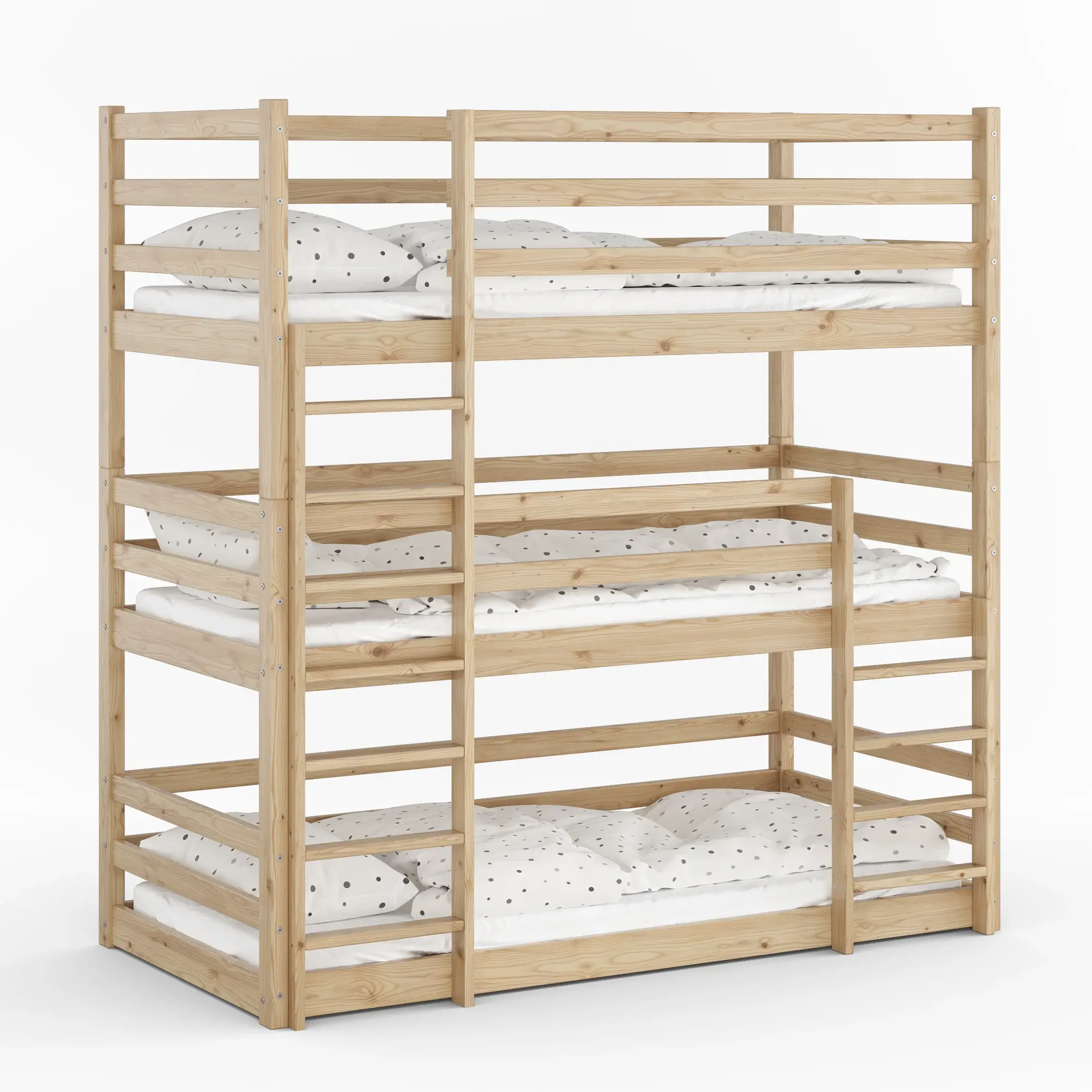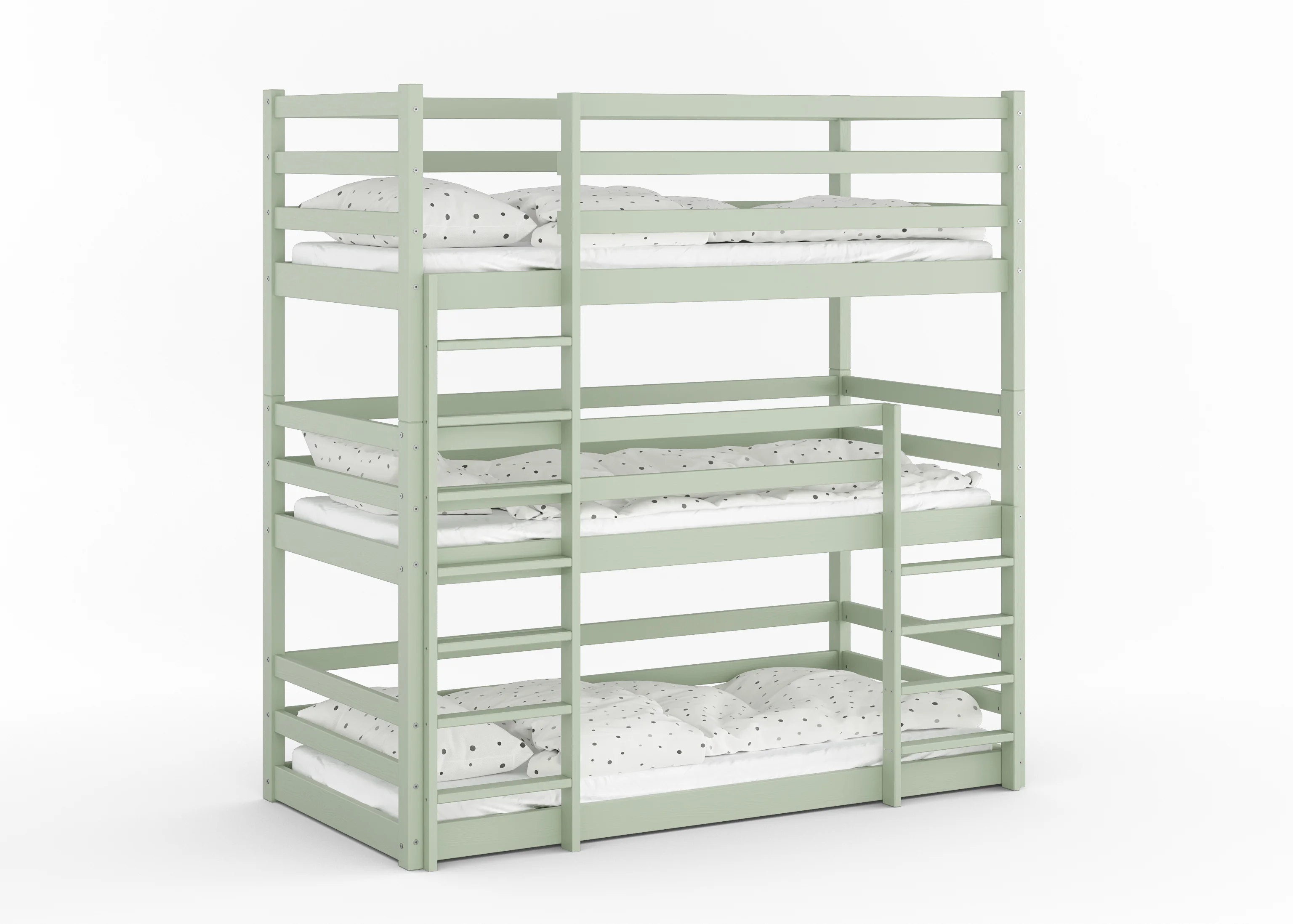 Drewniane łóżko piętrowe 3-osobowe Treko to solidne i bezpieczne rozwiązanie dla rodzeństwa, wykonane z litej polskiej sosny. Wytrzymałość do 150 kg na każdy poziom oraz podwyższone barierki gwarantują komfort i bezpieczeństwo na najwyższym poziomie.