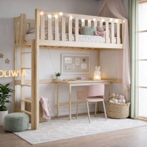 Niska konstrukcja antresoli (wys. 140 cm), ułatwia codzienne użytkowanie, a naturalne drewno sosnowe wprowadza do wnętrza ciepło i przytulny charakter. Prosty, uniwersalny design sprawia, że łóżko Cloudy Plus pasuje do wielu aranżacji dziecięcych wnętrz.