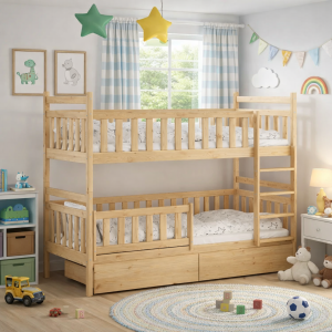 Łóżko piętrowe RINO to solidne i bezpieczne łóżko dziecięce z litego drewna sosnowego, wyposażone w praktyczne szuflady na pościel lub zabawki. Dzięki wysokiej wytrzymałości i funkcjonalnej konstrukcji idealnie sprawdzi się w pokoju rodzeństwa.