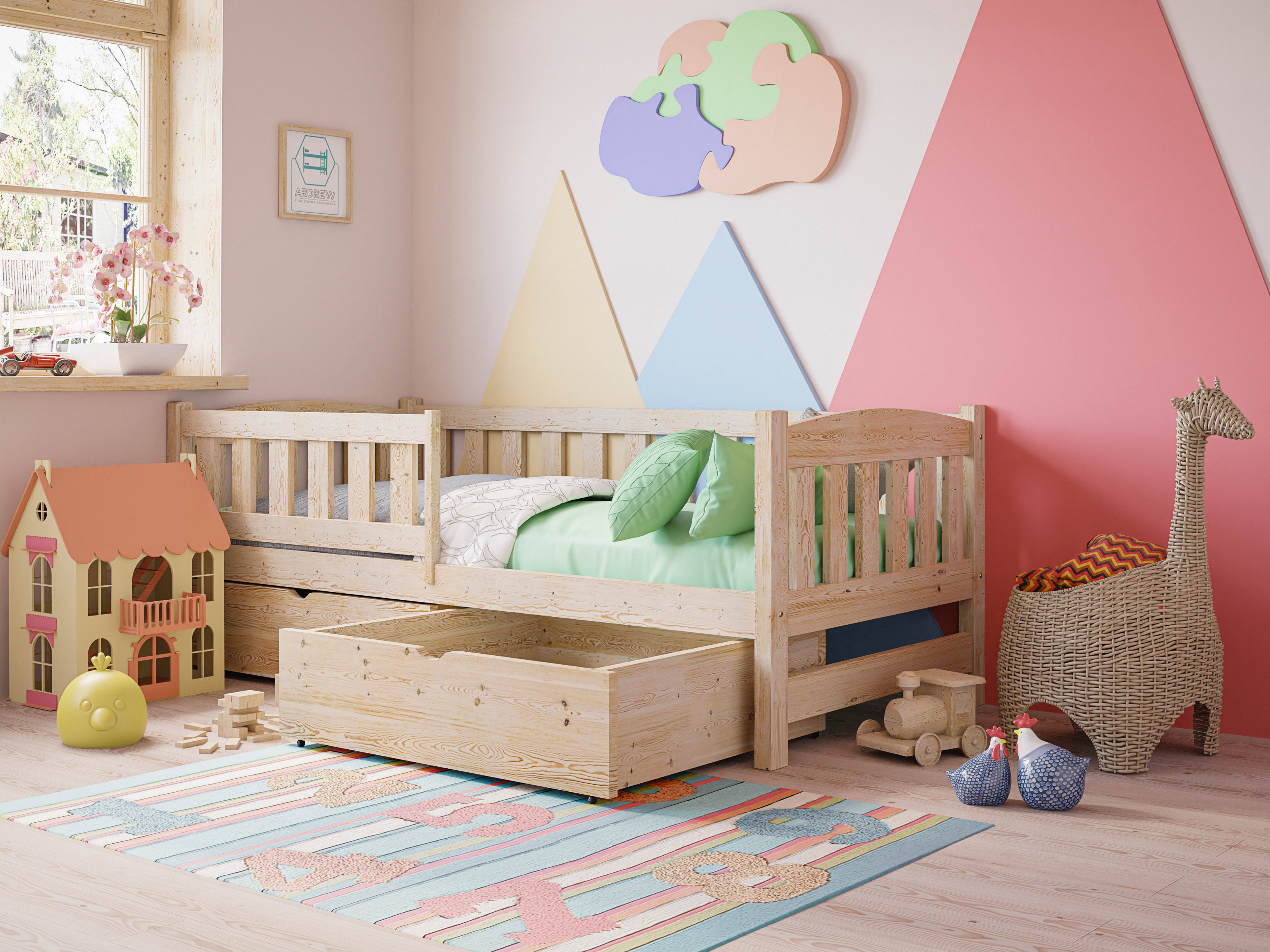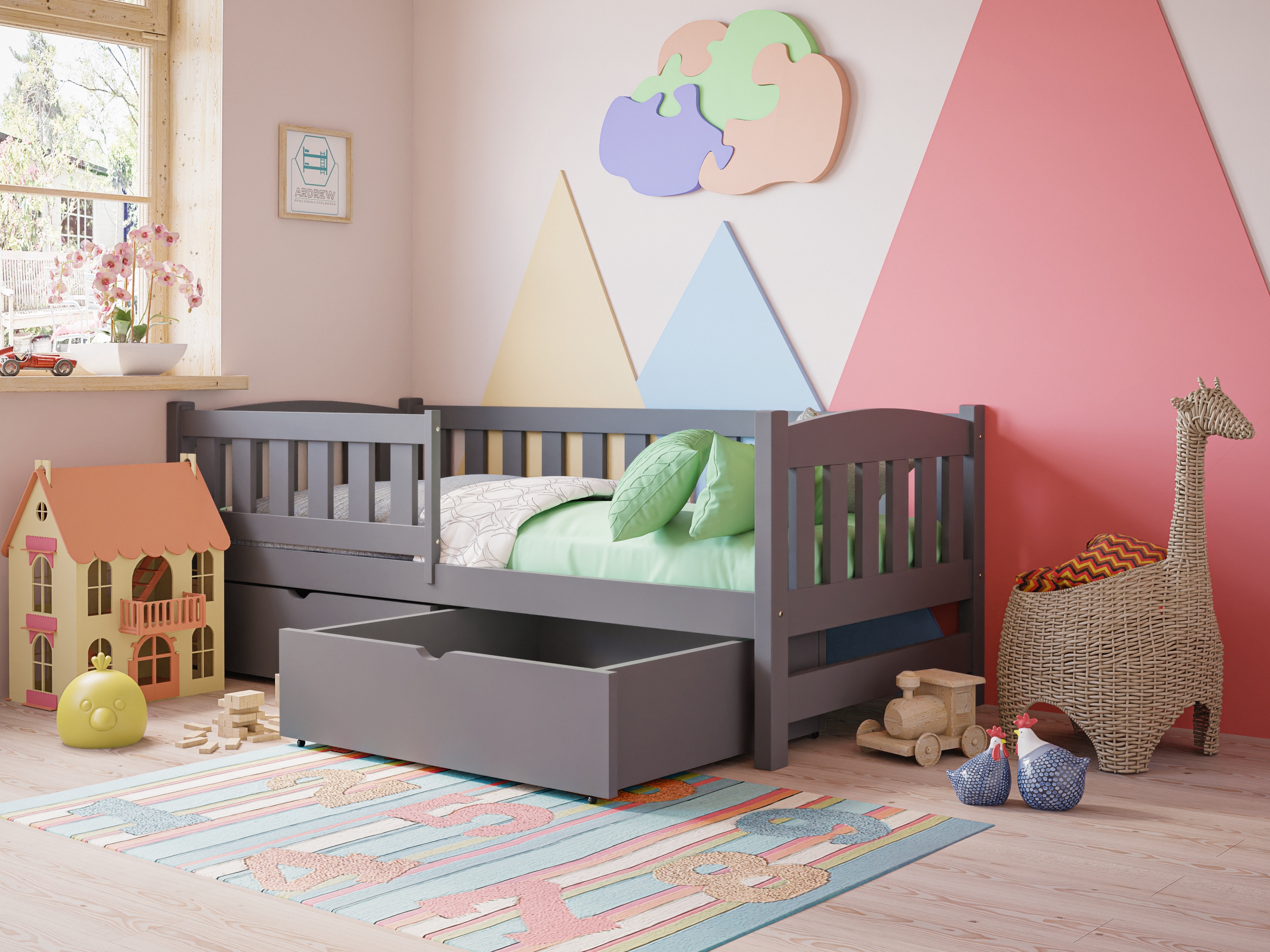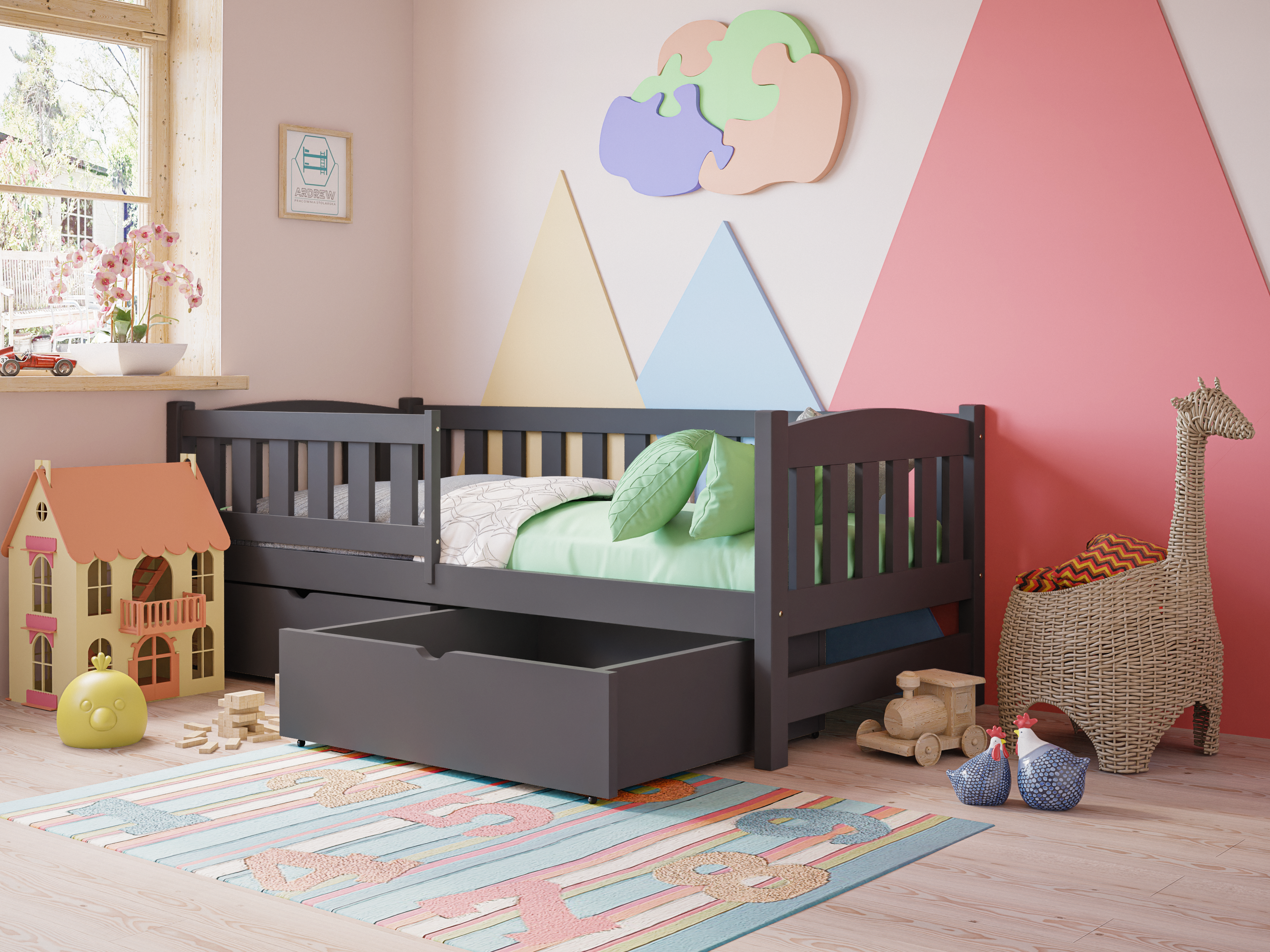 Drewniane łóżko pojedyncze dla dzieci Ania – Tapczan to funkcjonalny i bezpieczny mebel do pokoju dziecięcego. Solidna konstrukcja z drewna sosnowego, barierka ochronna, zaokrąglone krawędzie i możliwość doposażenia w szuflady sprawiają, że zapewnia komfortowy i bezpieczny sen. Nowoczesny design pasuje do każdego wnętrza, a certyfikowana, bezpieczna farba chroni dzieci i alergików.