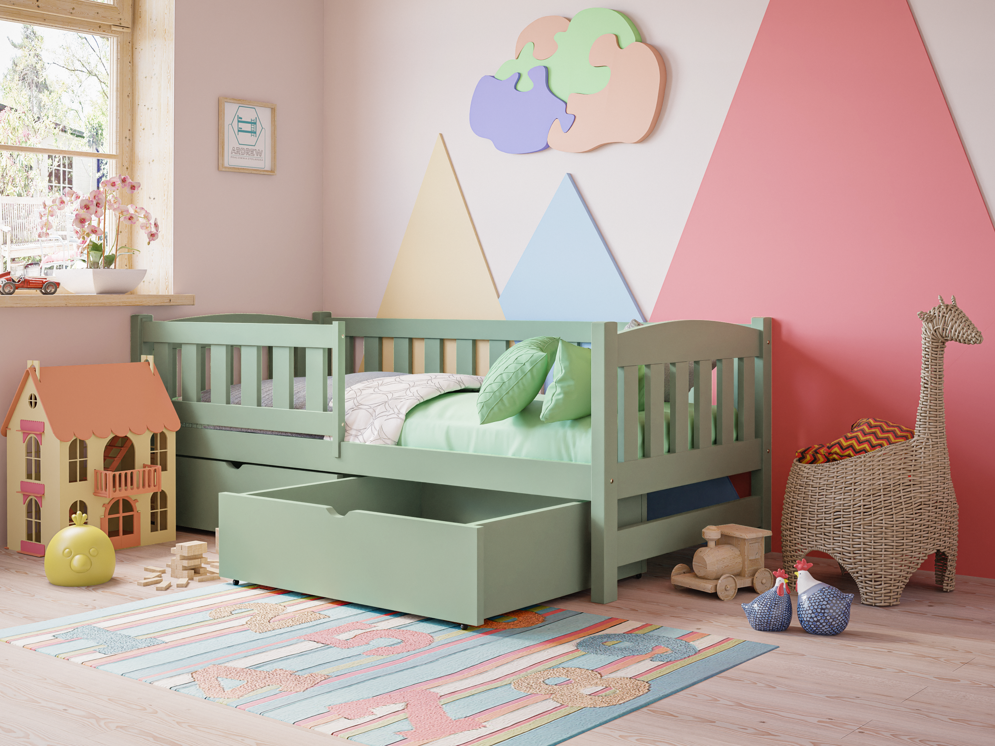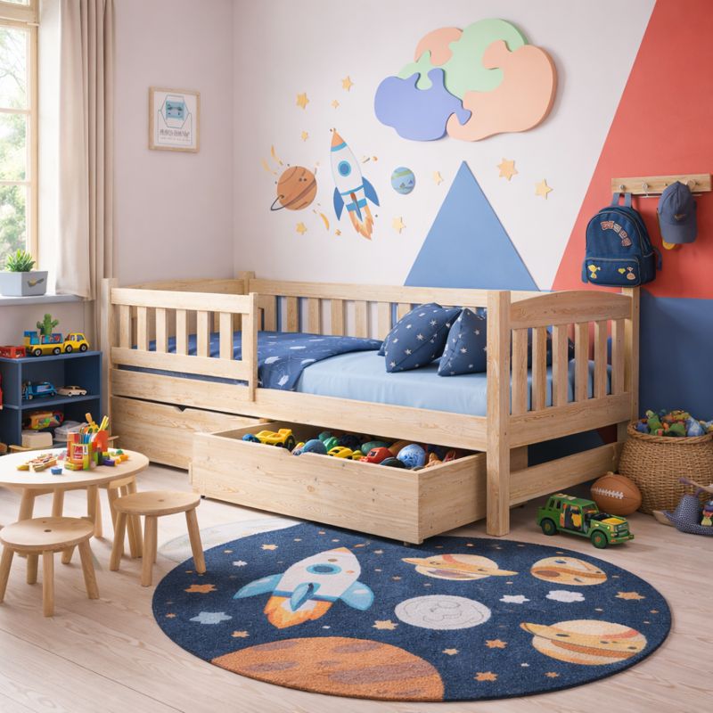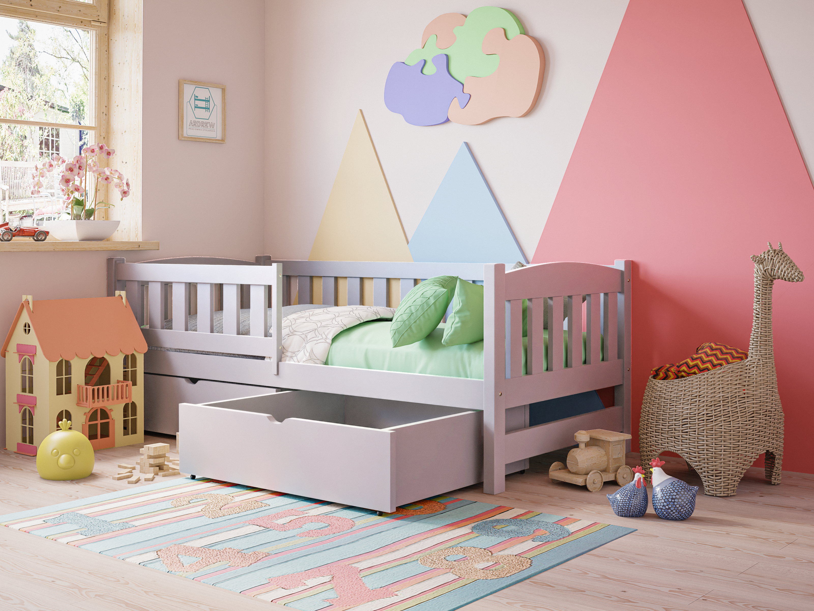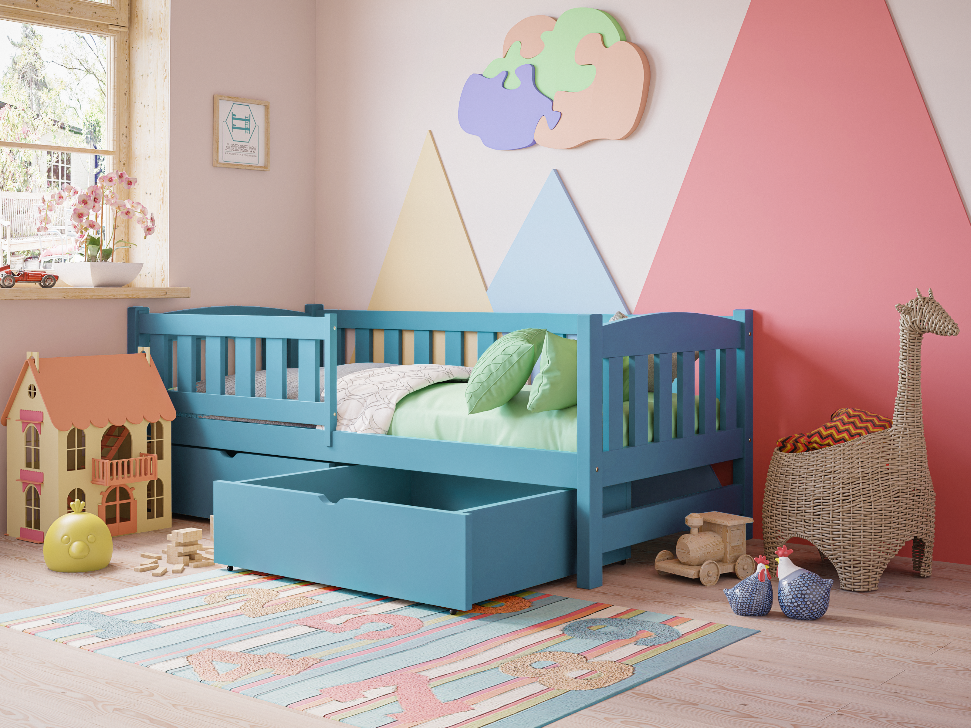 Drewniane łóżko pojedyncze dla dzieci Ania – Tapczan to funkcjonalny i bezpieczny mebel do pokoju dziecięcego. Solidna konstrukcja z drewna sosnowego, barierka ochronna, zaokrąglone krawędzie i możliwość doposażenia w szuflady sprawiają, że zapewnia komfortowy i bezpieczny sen. Nowoczesny design pasuje do każdego wnętrza, a certyfikowana, bezpieczna farba chroni dzieci i alergików.
