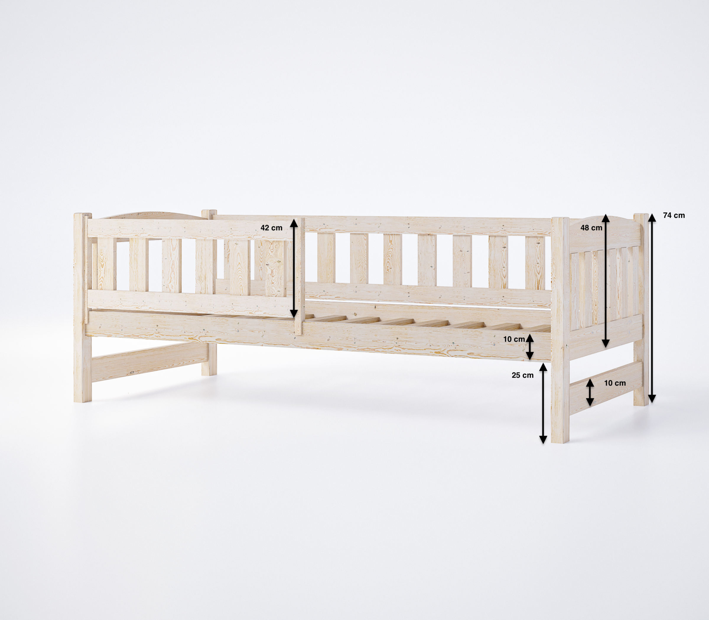 Łóżko Ania zostało wykonane z naturalnego drewna sosnowego, które jest trwałe i stabilne. Elementy łączone są za pomocą śrub młoteczkowych i grubych kołków, co zwiększa bezpieczeństwo użytkowania. Barierka ochronna minimalizuje ryzyko wypadnięcia, a zaokrąglone krawędzie chronią dziecko przed urazami.
