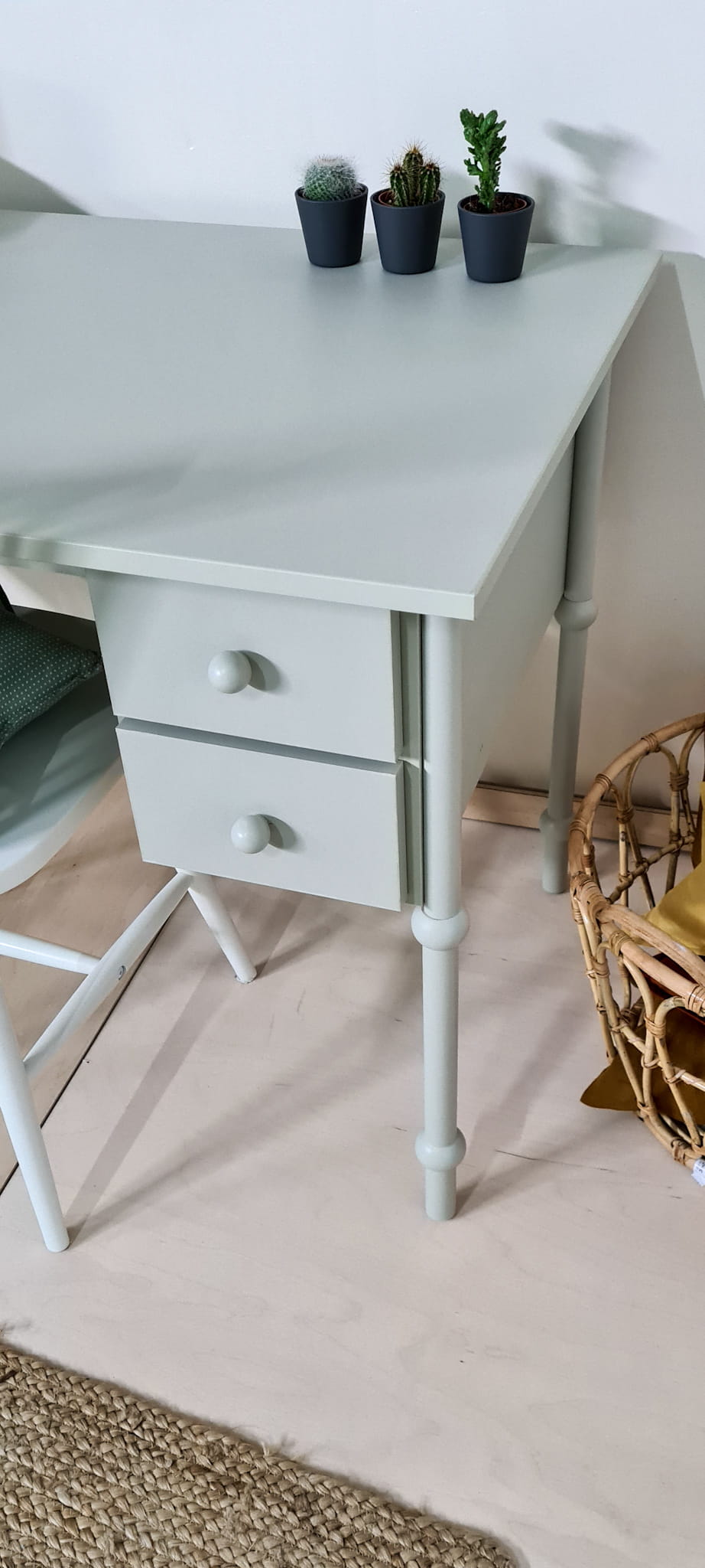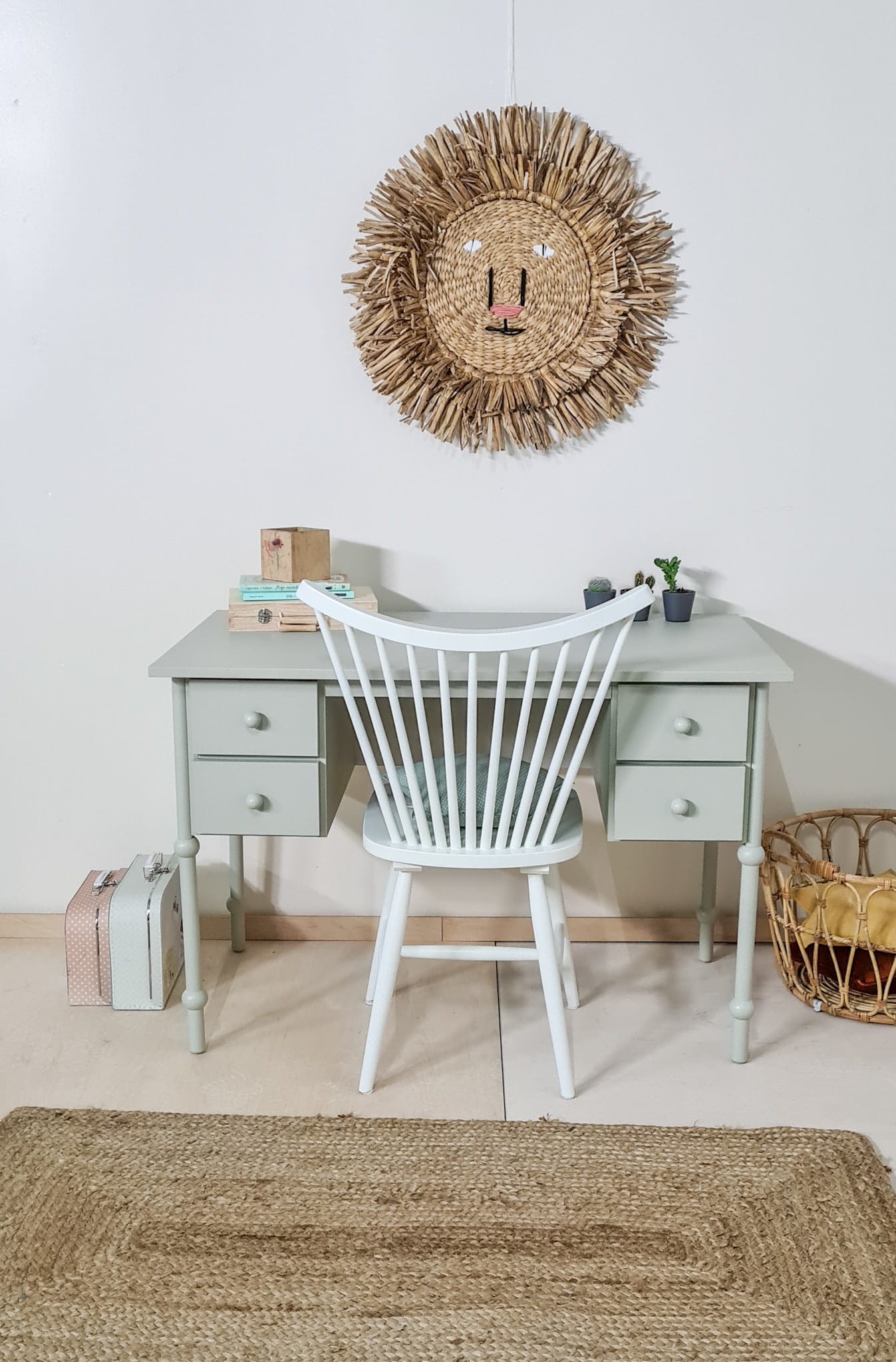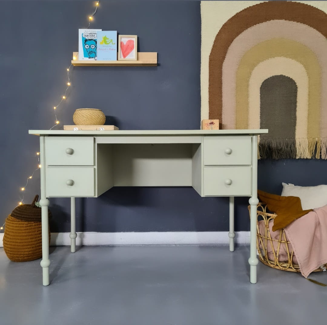Urokliwe i zgrabne biurko dziecięce w stylu retro w kolorze Oliwka. Drewniane biurko dziecięce Babushka Oliwka to nieodłączny element kolekcji mebli dziecięcych Babushka.