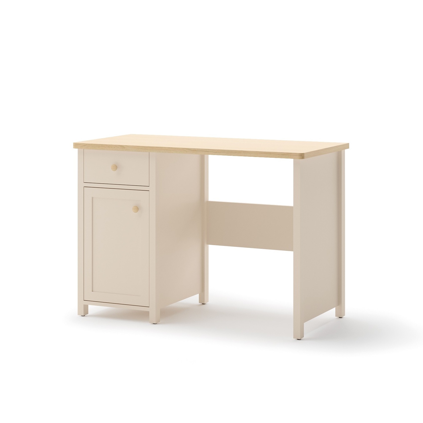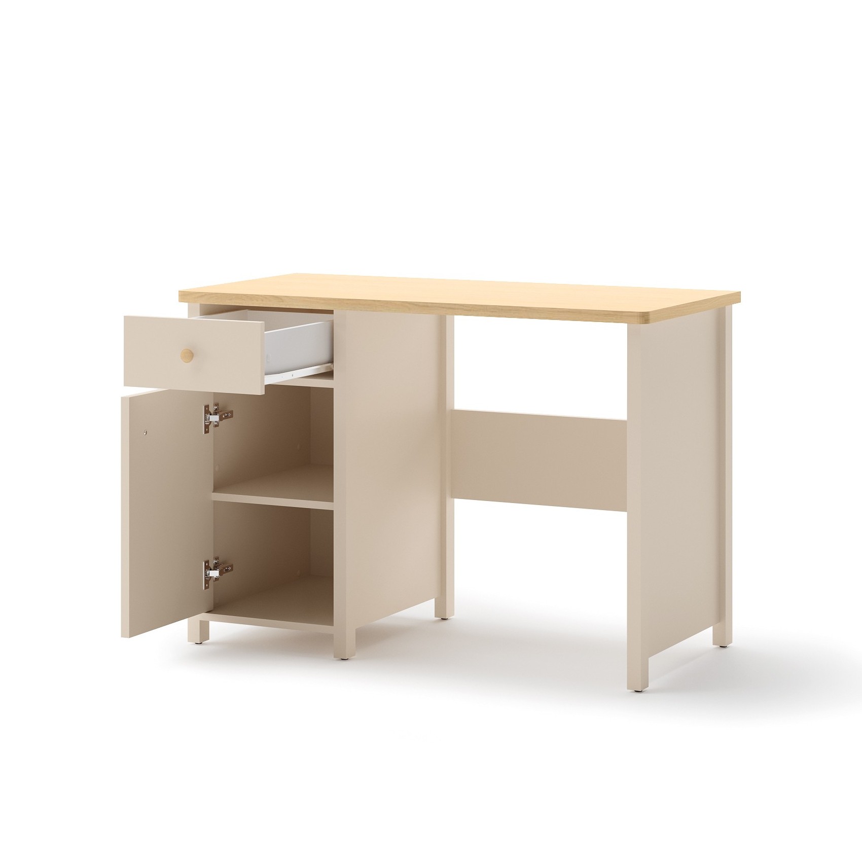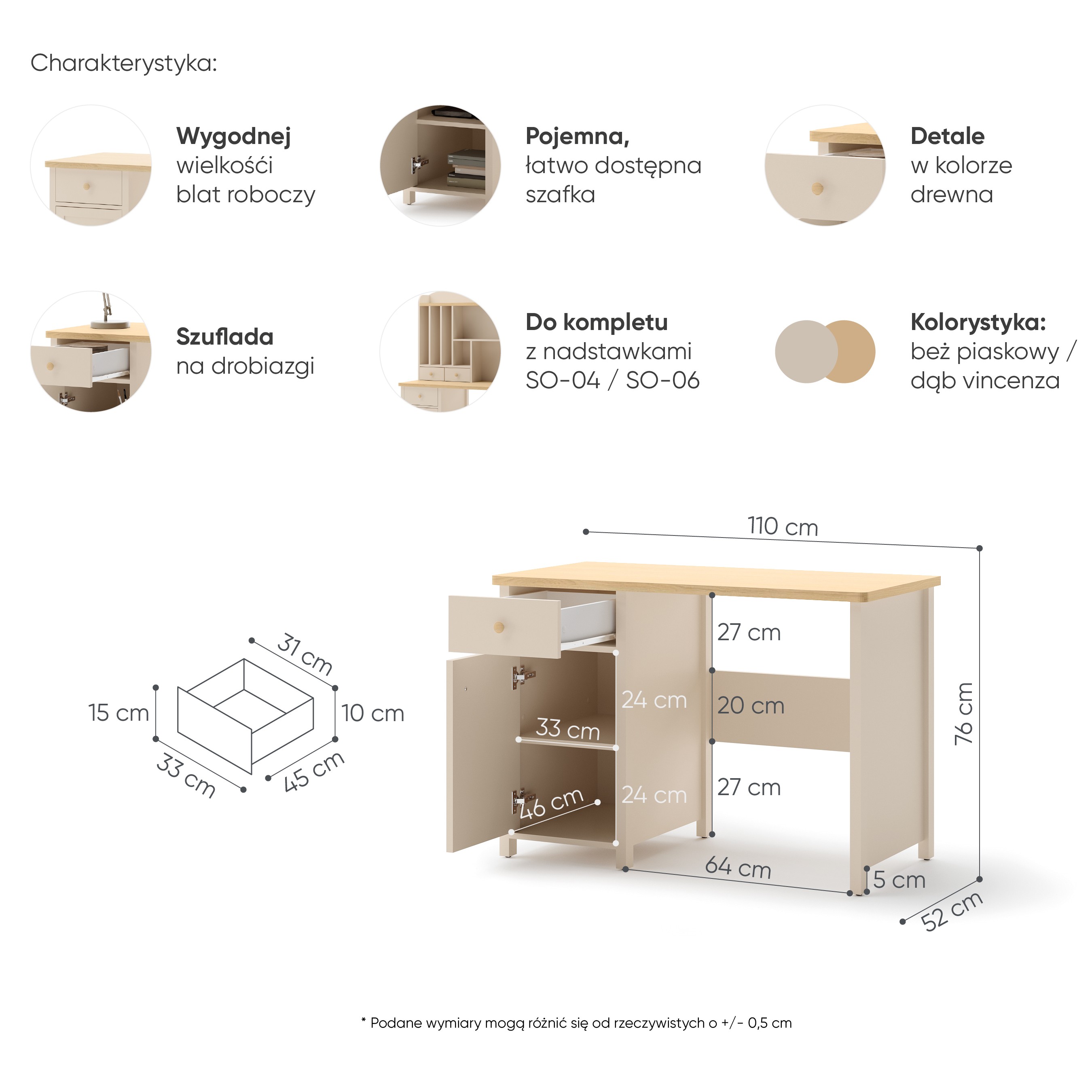 Biurko szkolne dziecięce Story 110 cm, kolor Beż Piaskowy / Dąb Vincenza Bielona. 1 szuflada, 1 drzwi, 1 półka. Płyta laminowana, zawiasy puszkowe, prowadnice rolkowe.