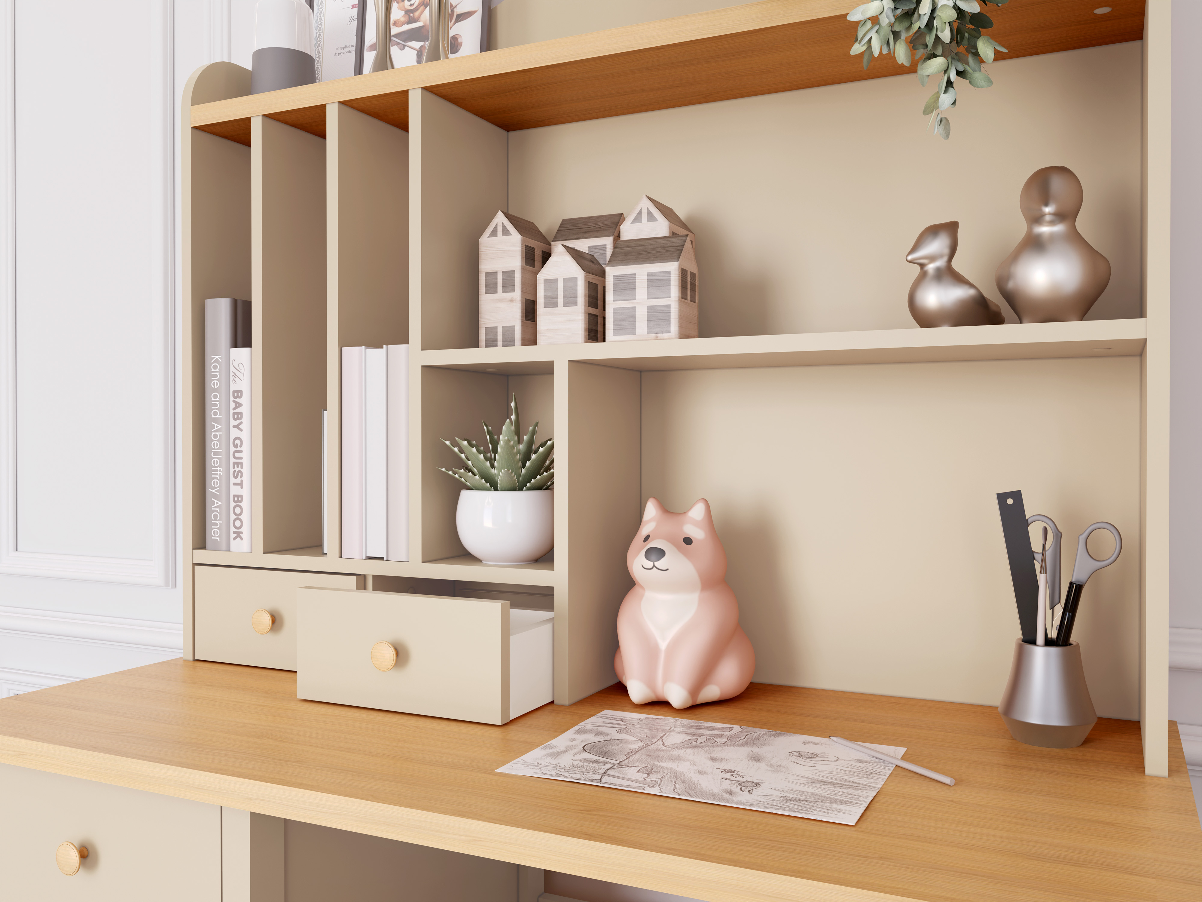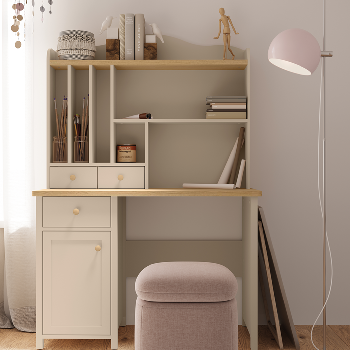 Funkcjonalne i stylowe biurko dziecięce Story to idealne miejsce do nauki, rysowania i zabawy. Dzięki szerokości 110 cm oraz praktycznemu układowi z szufladą, drzwiczkami i półką, ten model świetnie sprawdzi się w codziennym użytkowaniu – zarówno w pokoju malucha, jak i starszego ucznia. Ciepła kolorystyka Beżu Piaskowego i Dębu Vincenza Bielonego wprowadza harmonię i naturalny klimat do każdego dziecięcego wnętrza.