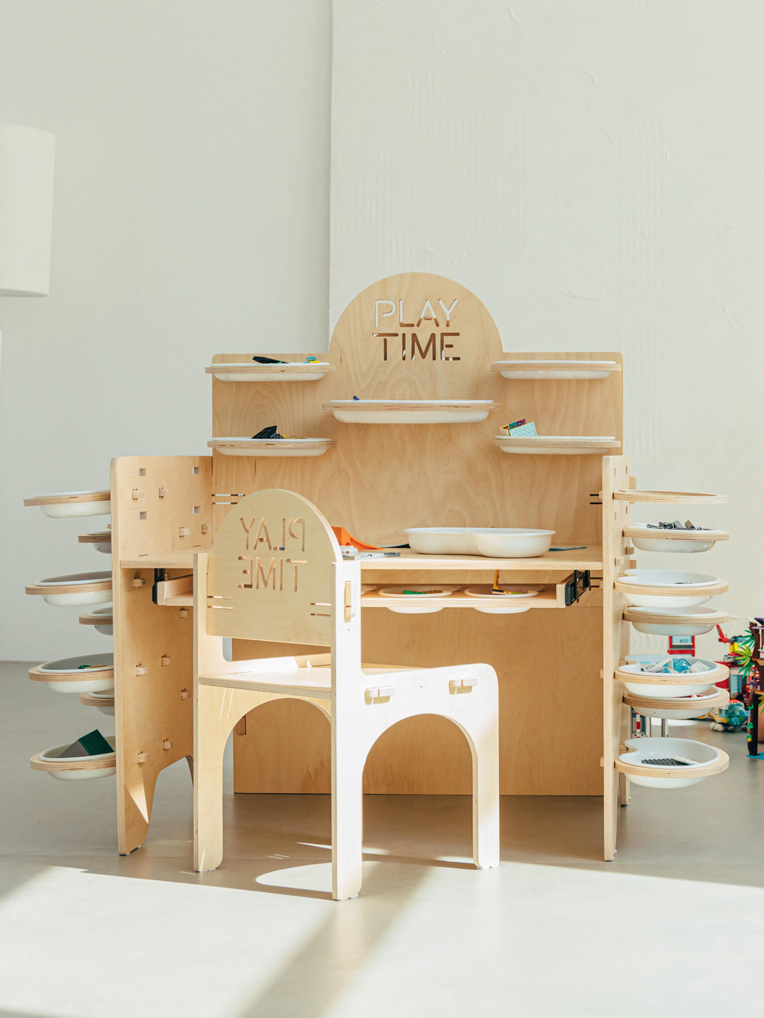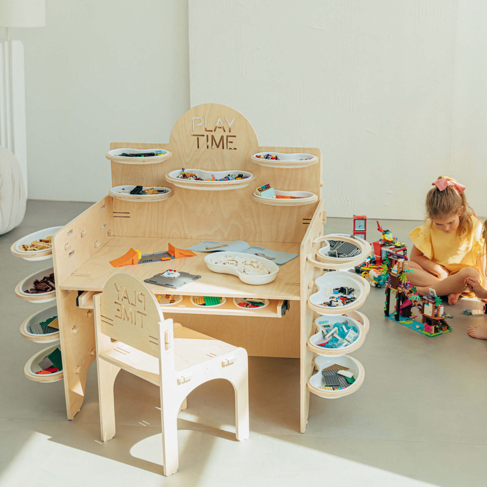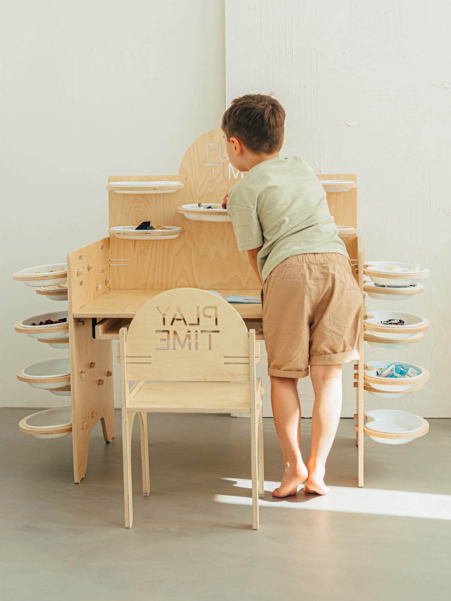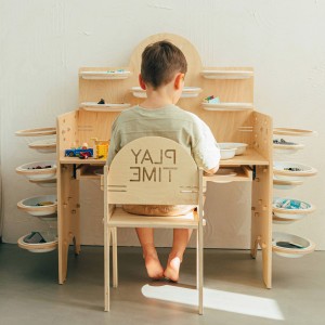 Krzesło i biurko dla dzieci Play Time to tylko część kolekcji. Pozostałe meble z kolekcji Play Time to obrotowy regał 360 oraz szafka z trzema półkami. Produkt przeznaczony do samodzielnego montażu. Mebel wykonany jest ze sklejki brzozowej.