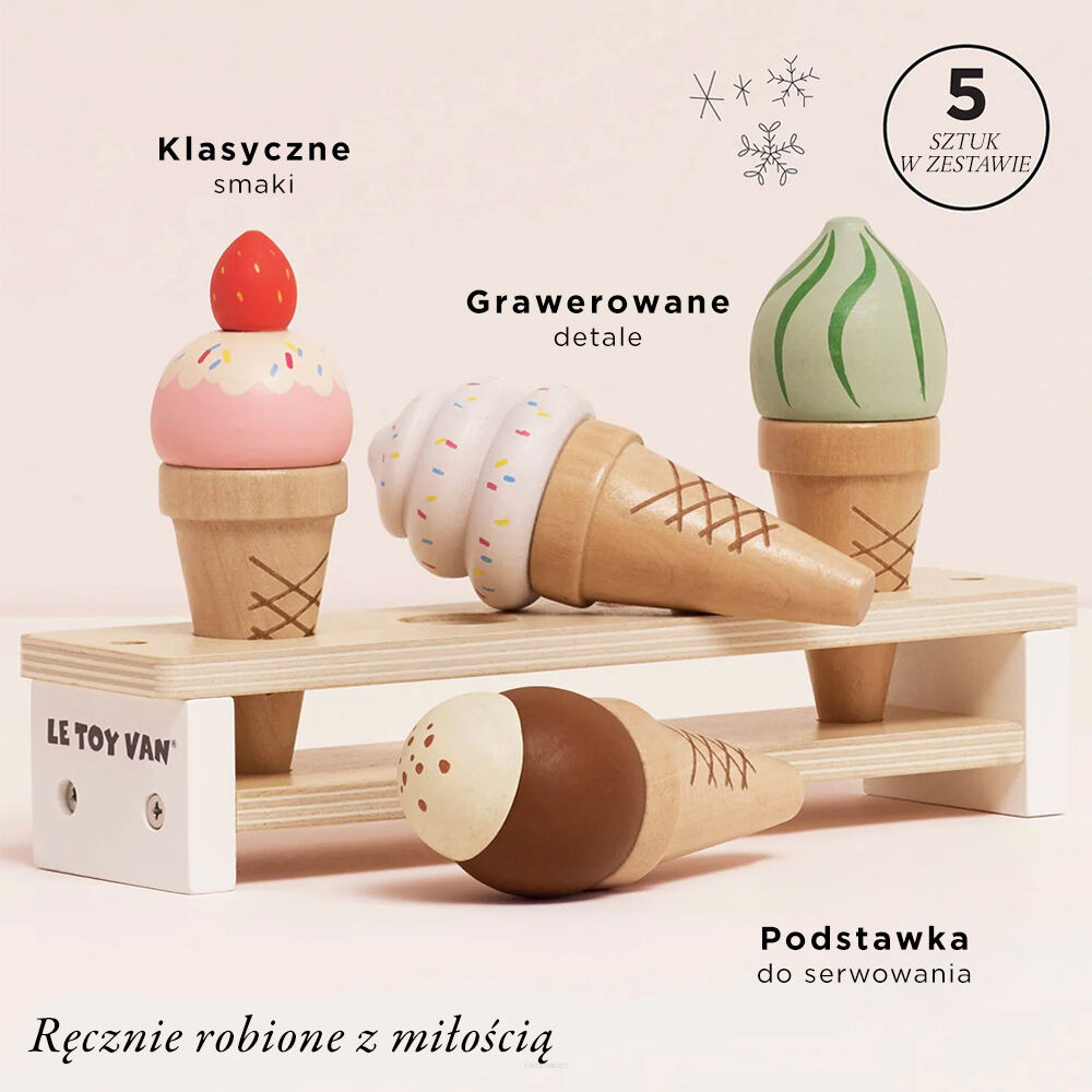 Uroczy drewniany zestaw lodów rożków Le Toy Van zawiera 4 kolorowe lody na stojaku. Wykonany z drewna FSC®, malowany bezpiecznymi farbami wodnymi. Idealny do zabawy w lodziarnię i kuchnię, rozwija wyobraźnię i kreatywność dziecka.