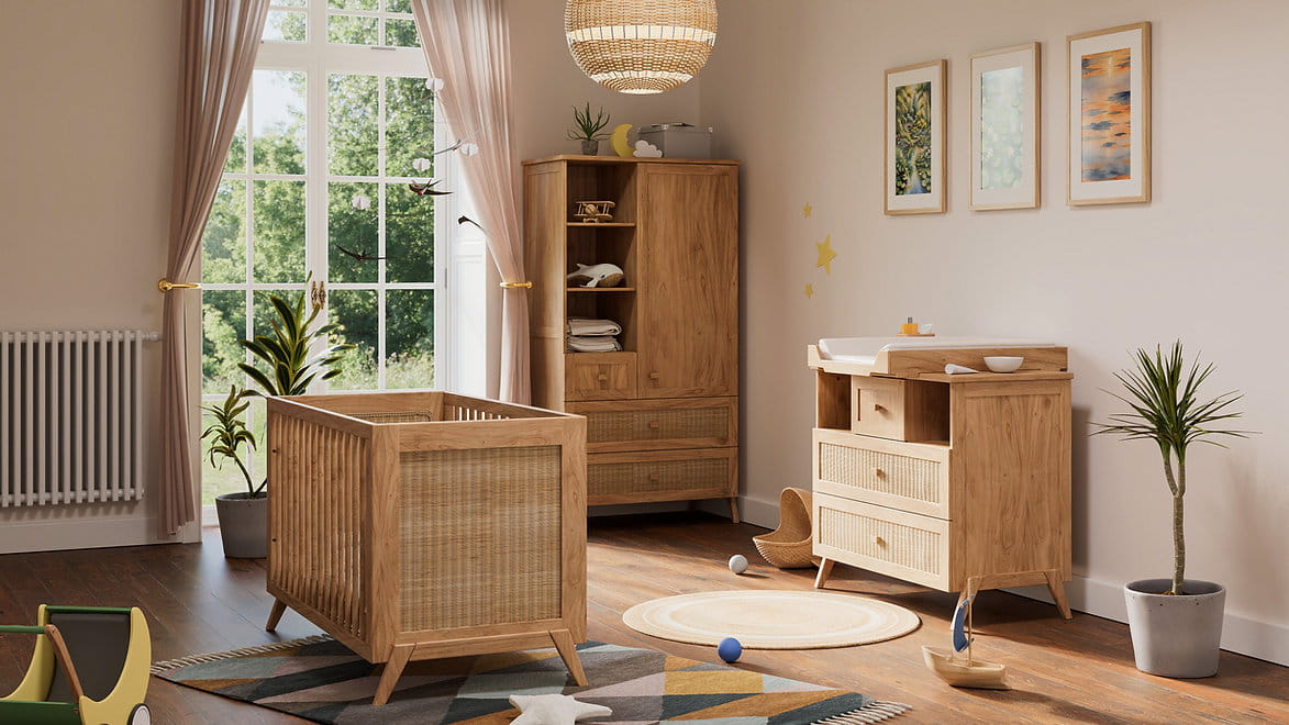 Wykonane z litego drewna oraz paneli fornirowanych, zachwyca nie tylko jakością, ale i zapachem prawdziwego drewna – bez imitacji, bez kompromisów. Piękne wstawki z plecionego rattanu (również w 100% naturalnego) dodają mu lekkości i ciepła, czyniąc je idealnym wyborem do pokoju dziecka w stylu boho, retro lub skandynawskim.