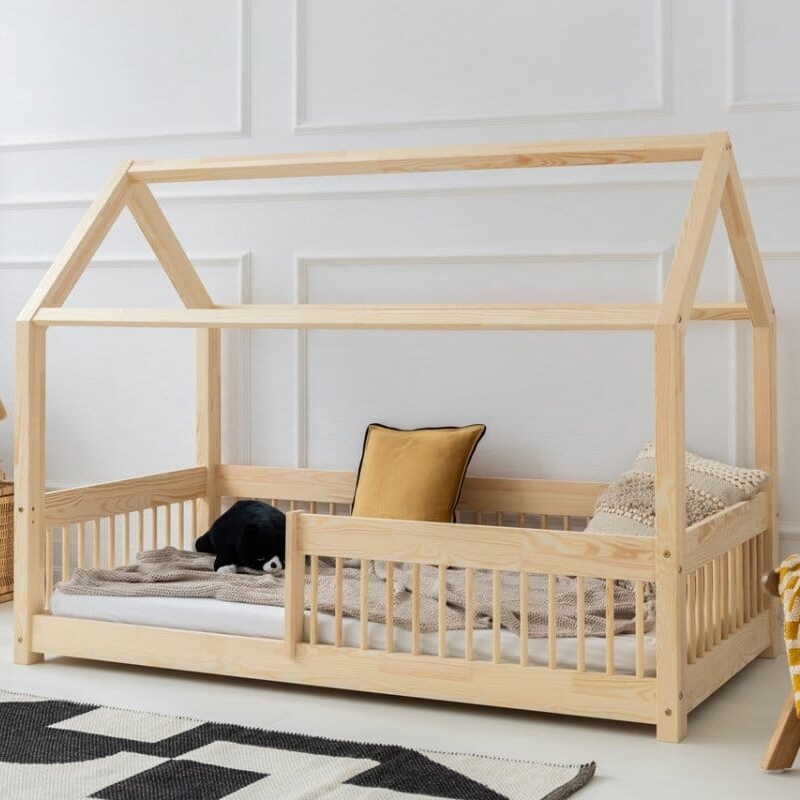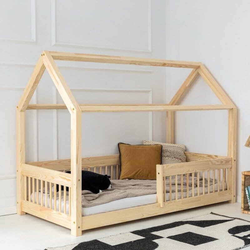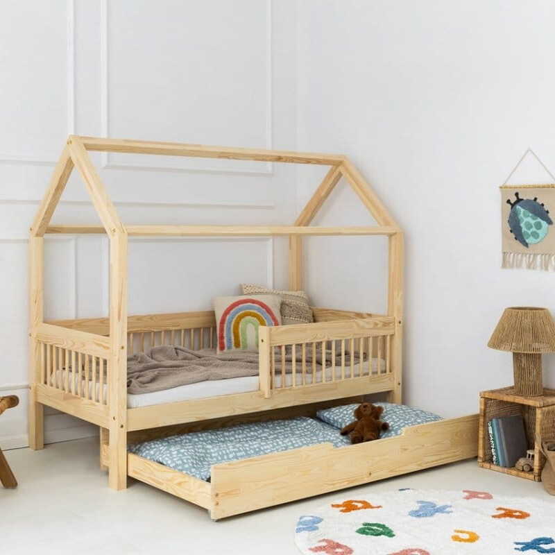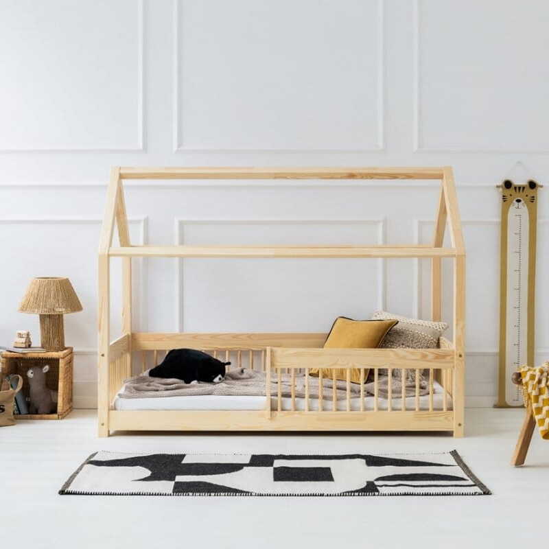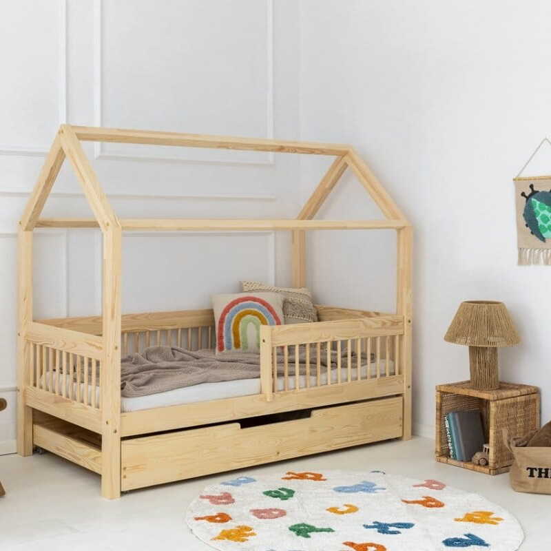 Łóżko domek dla dzieci Adeko z barierkami – ekologiczne, wykonane z drewna sosnowego, styl skandynawski. Możliwość wyboru rozmiaru, wysokości nóżek i opcjonalnej szuflady. Bezpieczne i trwałe łóżko dziecięce.