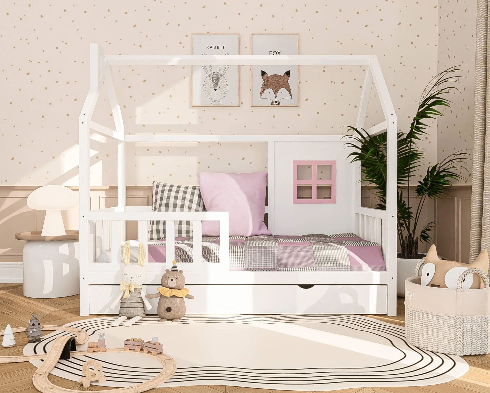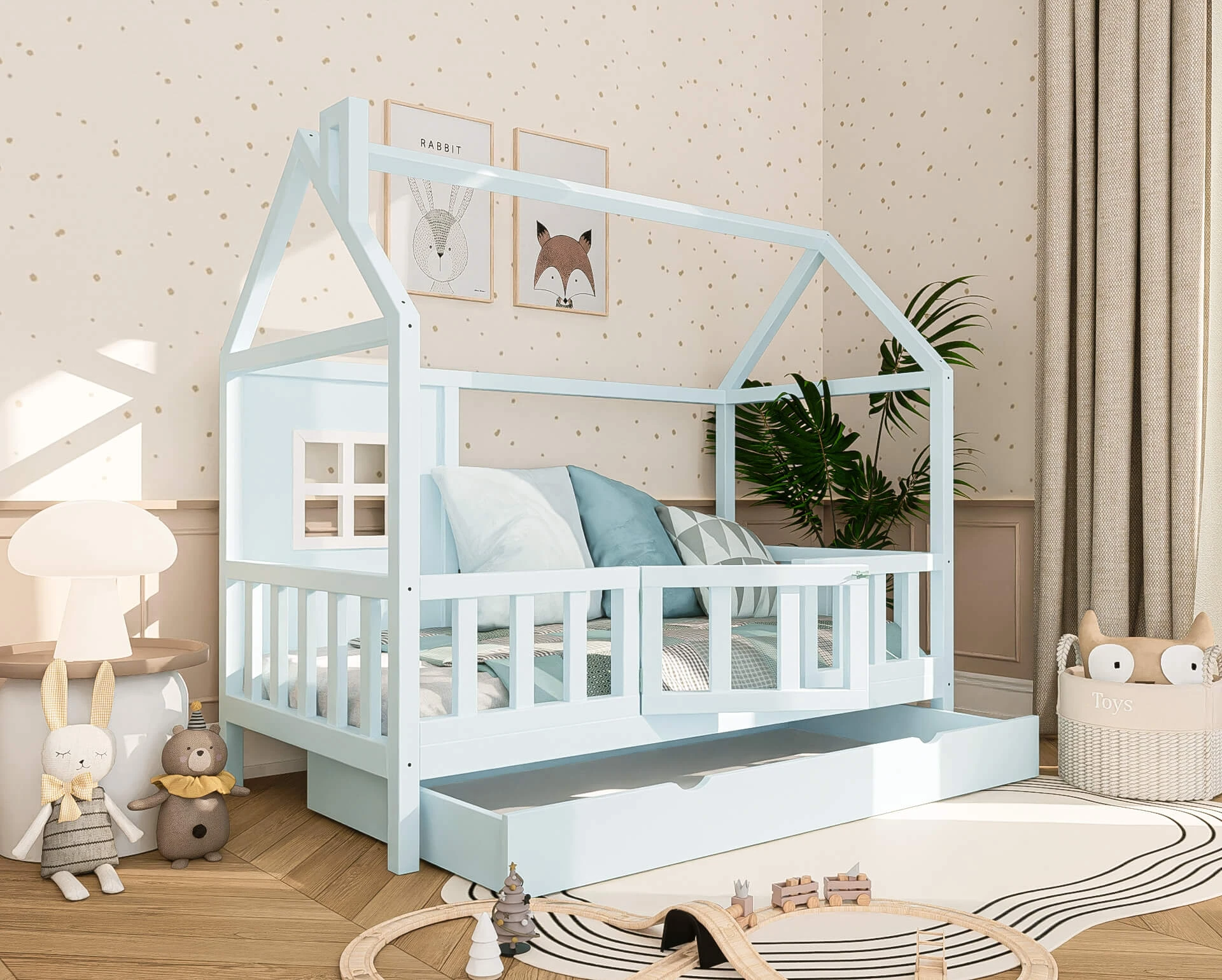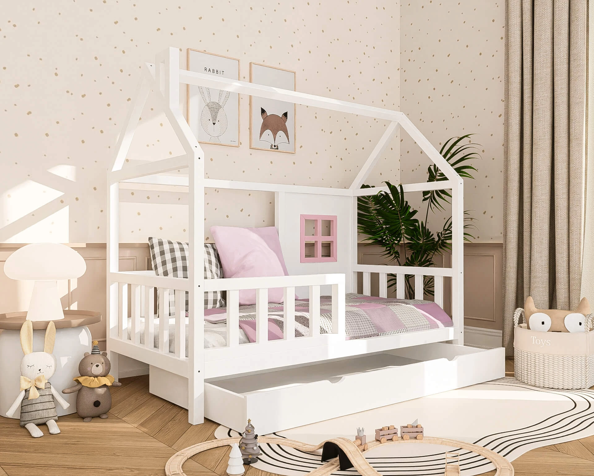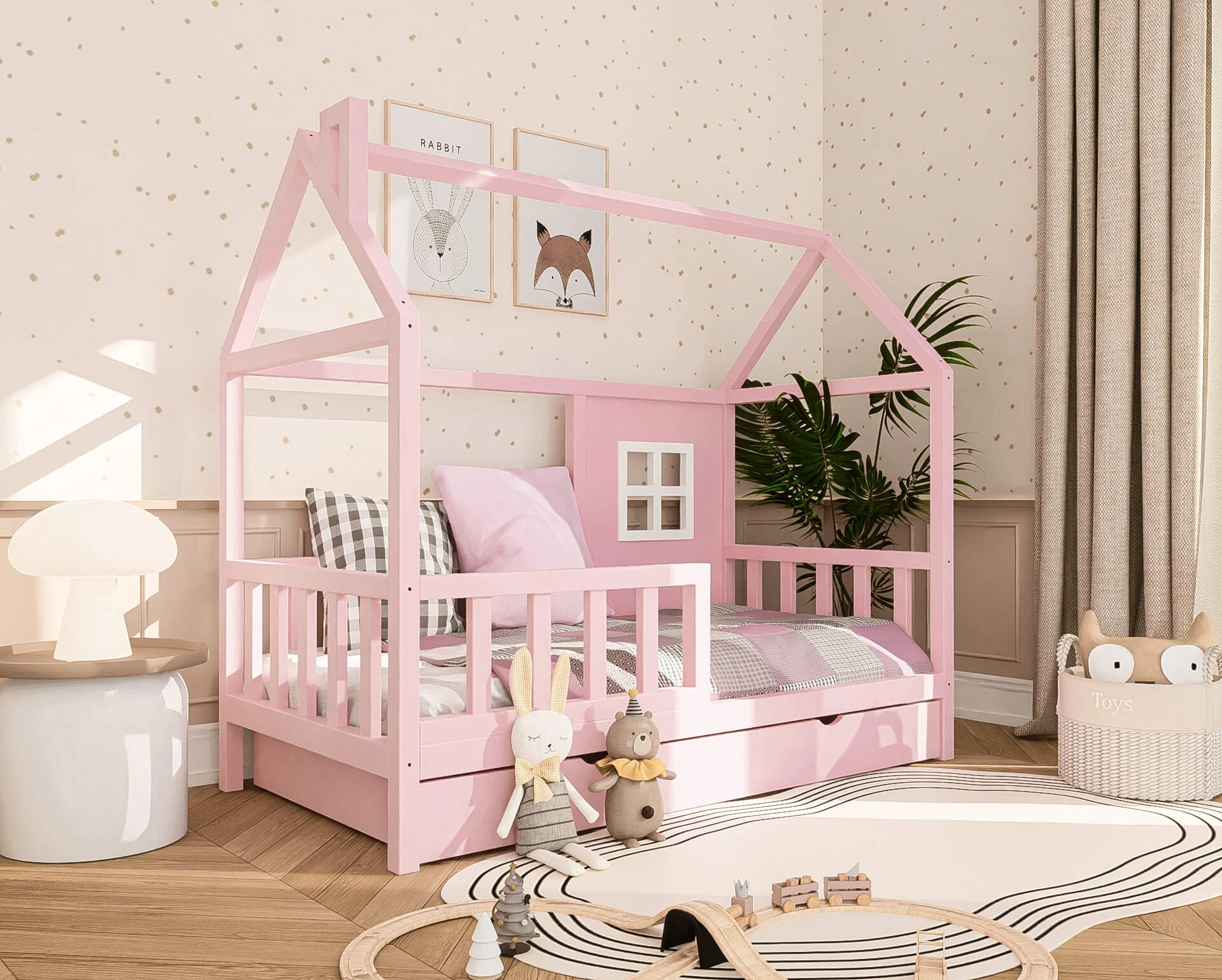 Łóżko domek dziecięce z litego drewna sosnowego to bezpieczne i funkcjonalne rozwiązanie, które łączy komfort snu z przestrzenią do zabawy. Idealne do pokoju dziecka, z opcją szuflady i praktycznymi barierkami.