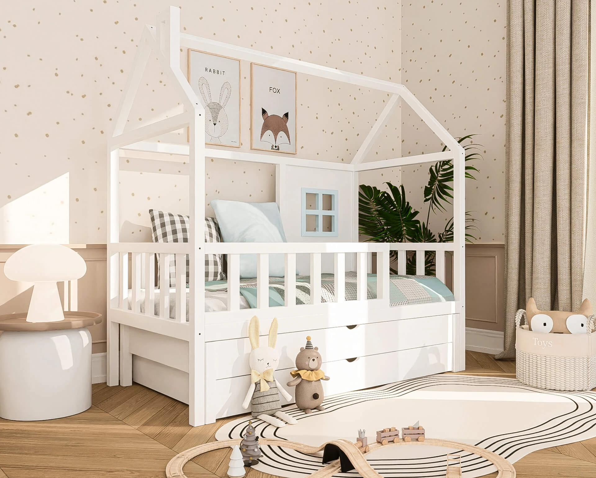 To łóżko w kształcie domku to idealny następca łóżeczka dziecięcego. Dzięki swojej formie rozwija wyobraźnię i wspiera samodzielność dziecka, a jednocześnie zapewnia komfortowy sen. Barierki ochronne zwiększają bezpieczeństwo, a demontowalna barierka frontowa pozwala dopasować łóżko do potrzeb.
