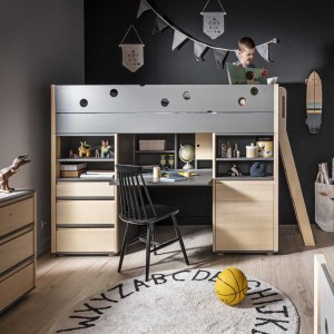 Drewniane łóżko podniesione z biurkiem i szufladami dla dzieci Funflex