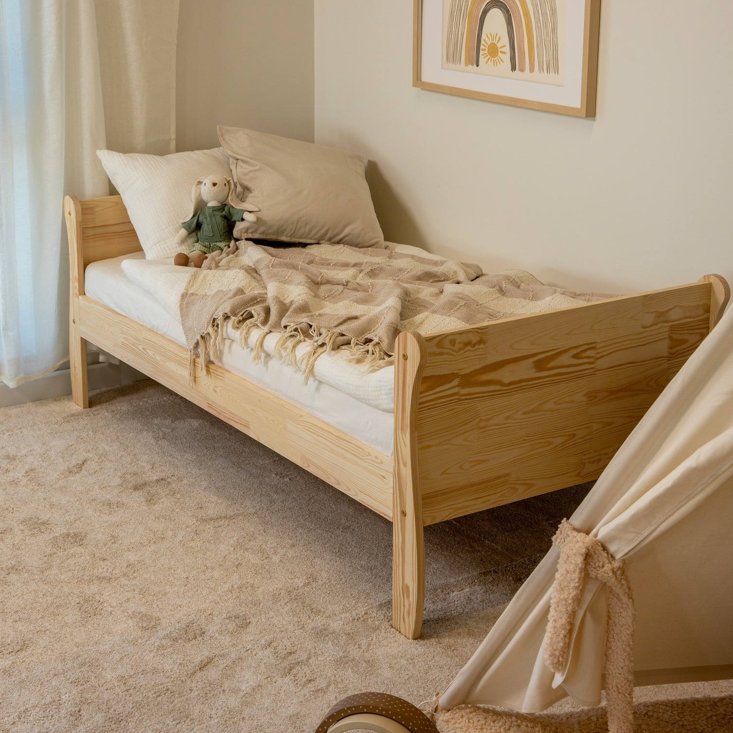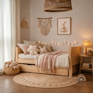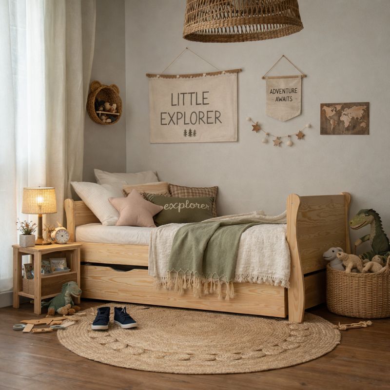 Prosta forma i naturalny odcień sosny sprawiają, że łóżko doskonale wpisuje się w skandynawski styl. Jasne drewno optycznie powiększa przestrzeń, nadając wnętrzu przytulny charakter, a minimalistyczny design pozwala dopasować łóżko do różnych aranżacji pokoju dziecięcego.