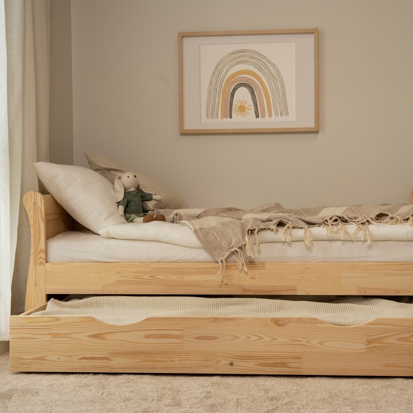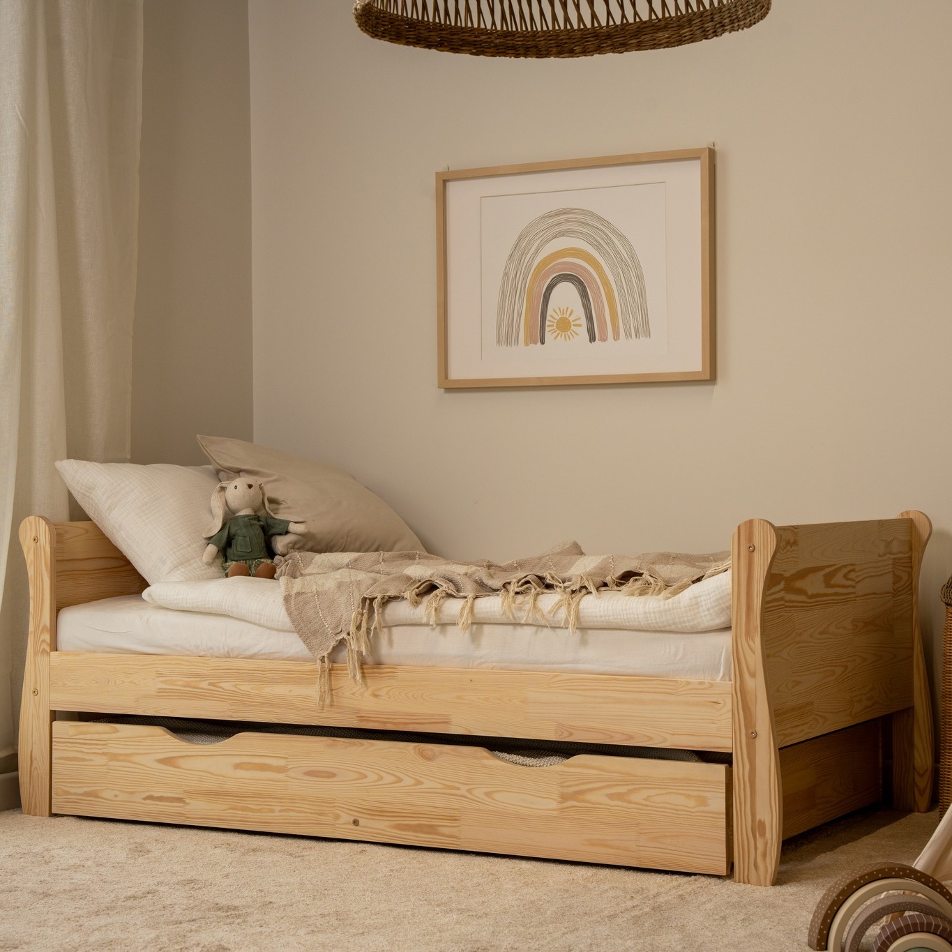 Łóżko dostępne jest w wersji z praktyczną szufladą na kółkach, która ułatwia przechowywanie pościeli, koców, ubrań lub zabawek. Szuflada może również pełnić funkcję dodatkowego miejsca do spania – lekkie wysuwanie i wsuwanie sprawia, że jest wygodna nawet dla dziecka.