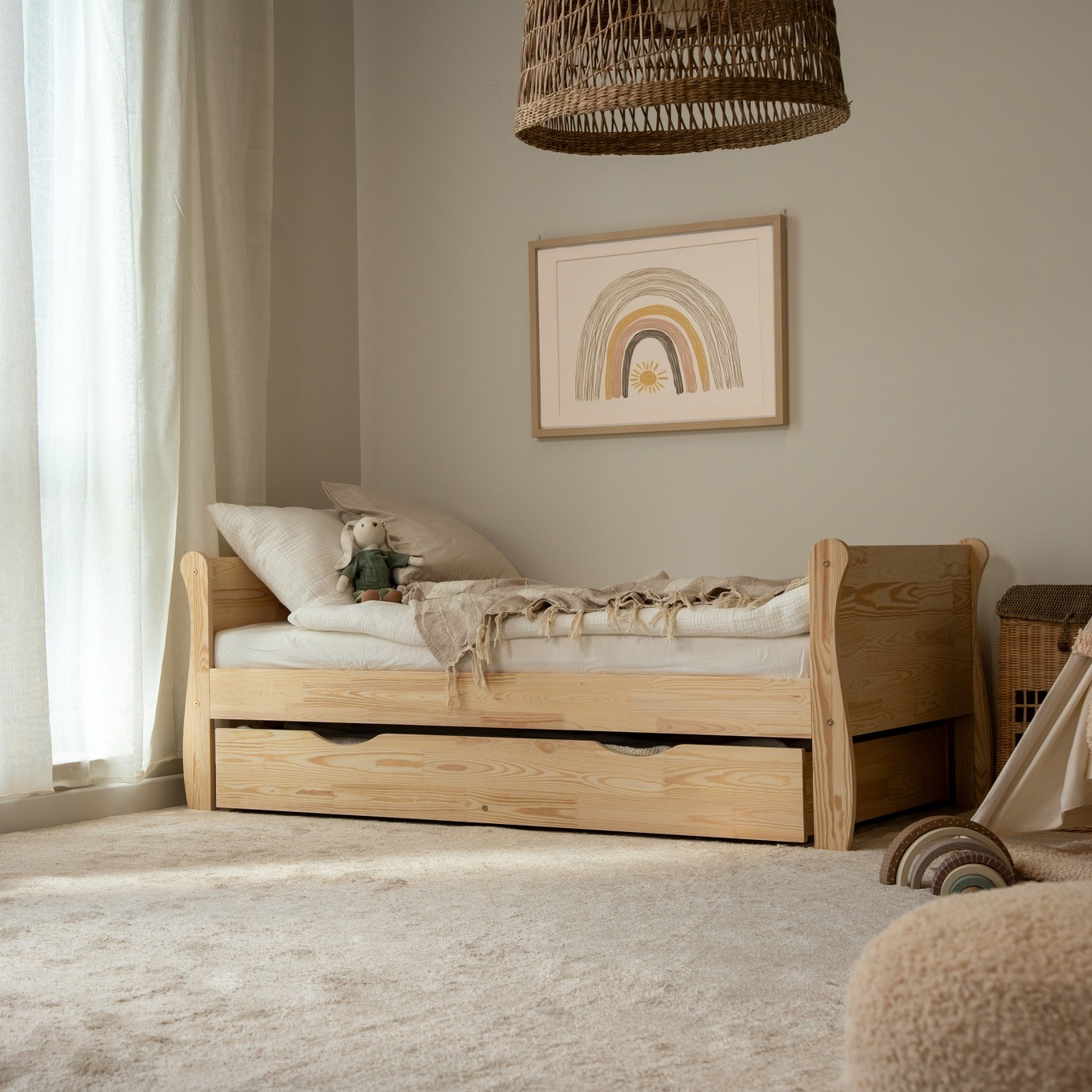 Łóżko dziecięce Paris wykonane z klejonego drewna sosnowego to trwałe i bezpieczne rozwiązanie do pokoju dziecka. Minimalistyczny, naturalny design wprowadza przytulny klimat, a zaokrąglone krawędzie zwiększają bezpieczeństwo. Wersja z szufladą na kółkach zapewnia dodatkowe miejsce do przechowywania lub spania. Możliwość dokupienia materaca dla komfortowego snu.
