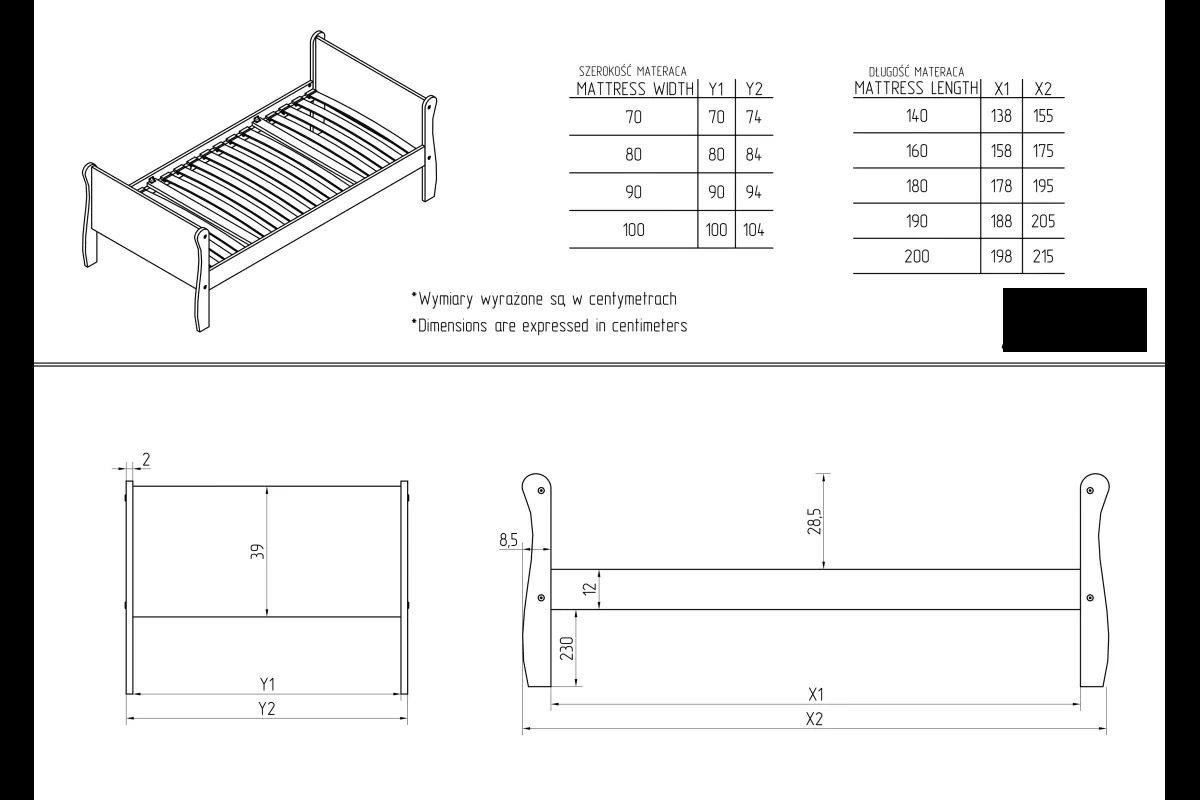 Możliwość dokupienia materaca głównego i materaca do szuflady, Zalecana grubość materaca od 8 do 12 cm - zobacz Materace