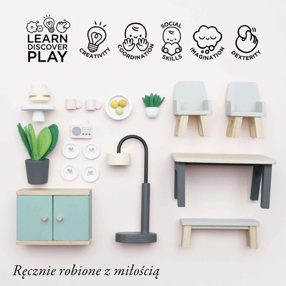 Drewniany zestaw mebelków do domku dla lalek – jadalnia Daisylane od Le Toy Van to elegancki komplet z stołem, krzesłami, kredensem i akcesoriami. Wykonany z drewna FSC®, malowany bezpiecznymi farbami. Idealny do zabawy w dom, rozwija kreatywność i wyobraźnię dziecka.