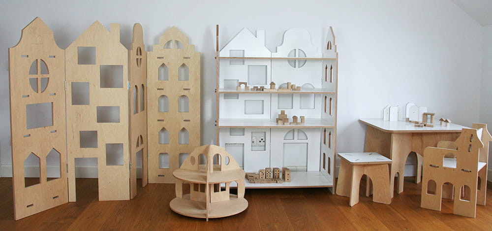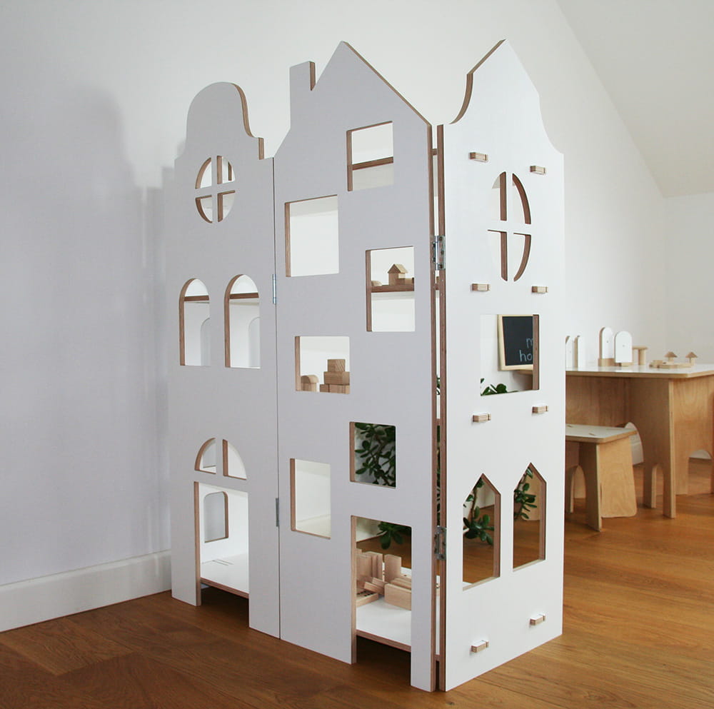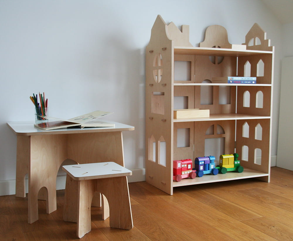 Mebel można w kilka chwil zmontować oraz rozmontować bez stosowania dodatkowych narzędzi. W opcji rozbudowanej przekształca się w domek dla lalek. Przy wyjęciu trzech półek zyskuje się wygodne biurko.