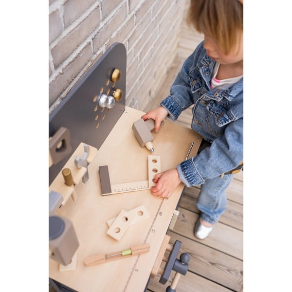 Drewniany Warsztat Majsterkowicz Jabadabado w grafitowej kolorystyce, z certyfikowanego drewna FSC. W pełni wyposażony, idealny do kreatywnej zabawy dzieci.