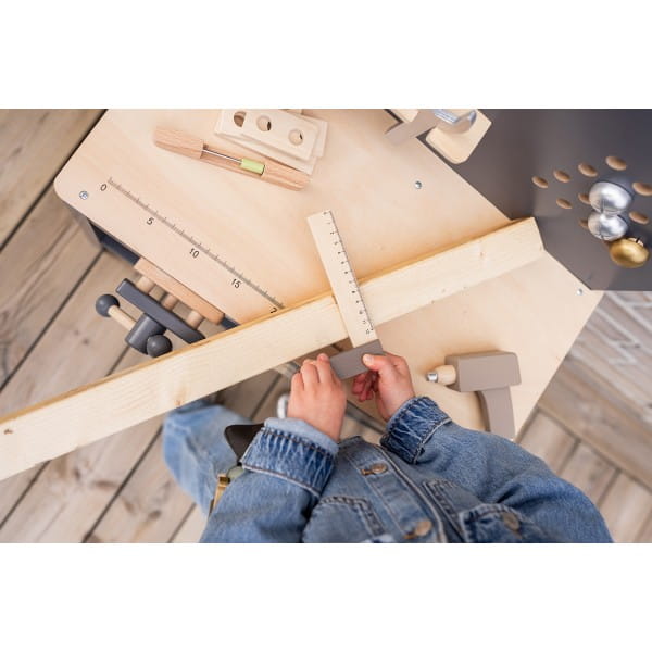 Drewniany Warsztat Majsterkowicz Jabadabado to spełnienie marzeń każdego małego konstruktora. Stylowa grafitowa kolorystyka w połączeniu z naturalnym drewnem sprawia, że warsztat zachwyca nie tylko możliwościami zabawy, lecz także swoim nowoczesnym designem. Stworzony z myślą o kreatywności, rozwija zdolności manualne i pobudza dziecięcą wyobraźnię podczas codziennej zabawy w majsterkowanie.