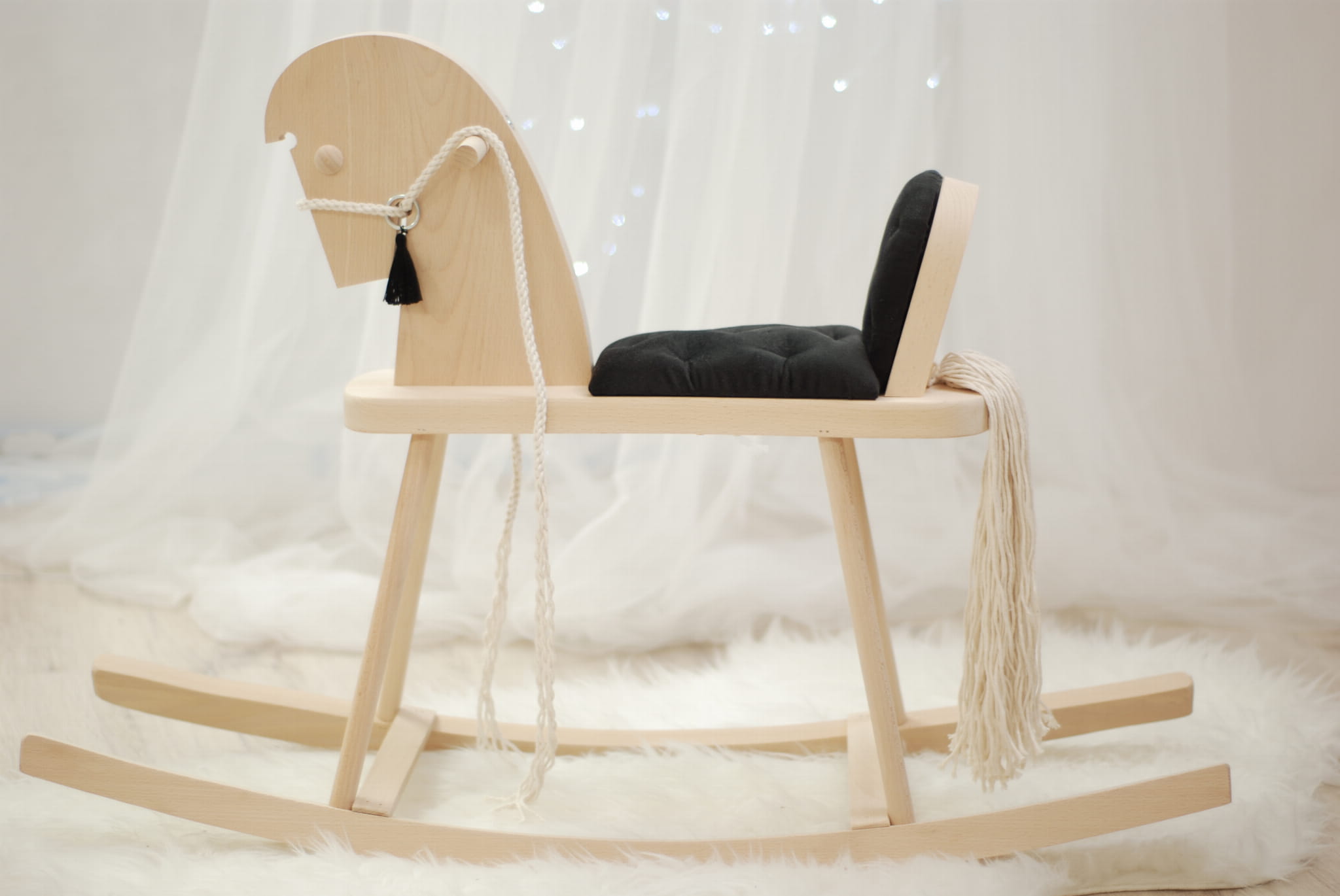 Naturalny drewniany konik na biegunach wykonany z trwałego drewna bukowego. Ręcznie robiony, dopracowany w każdym detalu i możliwość personalizacji – wybierz kolor siodełka oraz lejców. Stabilny, bezpieczny i ponadczasowy. Idealny na prezent i jako ozdoba pokoju dziecka.