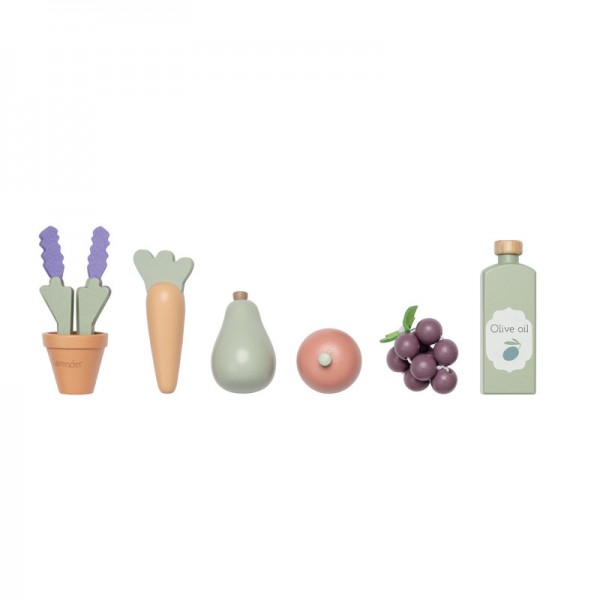Zawartość zestawu: torba materiałowa, doniczka z lawendą, 17 produktów spożywczych