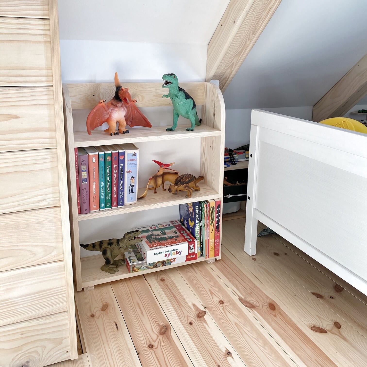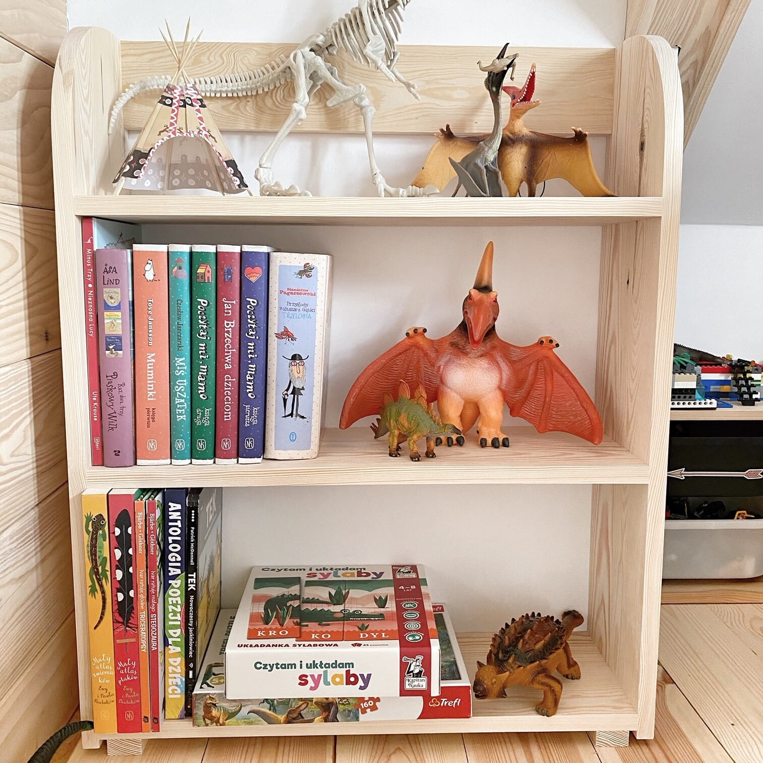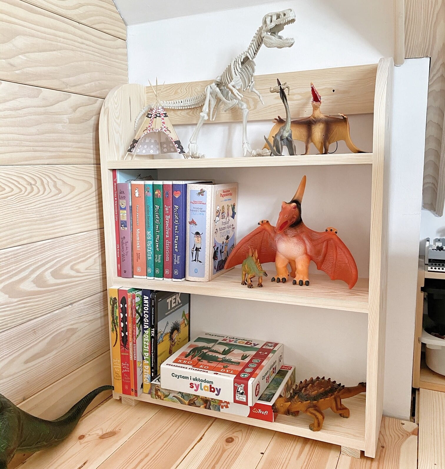 Drewniany regał Montessori dla dzieci. Wolnostojąca biblioteczka z trzema półkami, stabilna, bezpieczna i elegancka. Idealna do pokoju, przedszkola i sal zabaw.