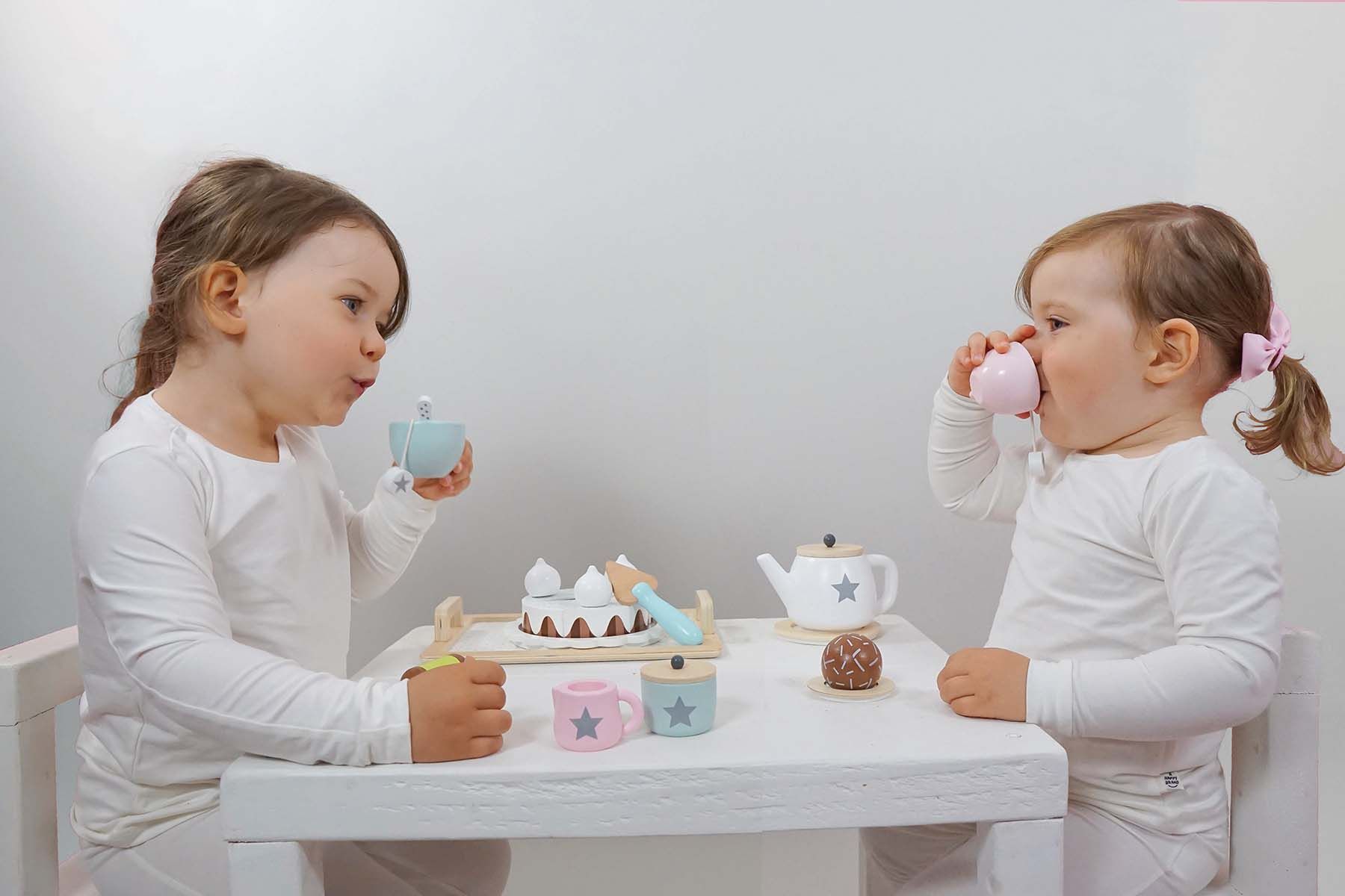 W zestawie: taca w kolorze naturalnego drewna i klasycznej bieli z delikatnymi kropeczkami, taca posiada uchwyty ułątwiające jej przenoszenie, dwie filiżanki pastelowo niebieska i pastelowo różowa, obie z uchwytani do trzymania i dwa talerzyki pod filiżanki, dwie łyżeczki, dwie torebki herbaty, talerzyk i dwie słodkości, czajniczek biały ze srebną gwiazdką i pokrywką, zamykana cukierniczka oraz dzbanuszek na mleko lub śmietankę.