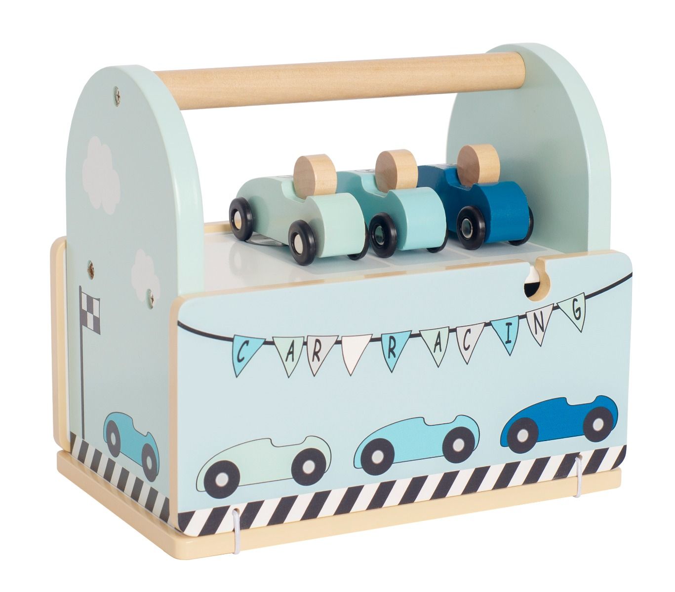 Drewniany tor wyścigowy marki Jabadabado to świetna zabawka dla małych fanów motoryzacji. Zestaw zawiera 3 wyścigówki w odcieniach niebieskiego oraz 12 elementów toru z metą i pochylnią startową. Praktyczne pudełko pełni funkcję padoku i ułatwia przechowywanie. Zabawka rozwija wyobraźnię, zapewnia mnóstwo emocji i jest odpowiednia dla dzieci od 2. roku życia.